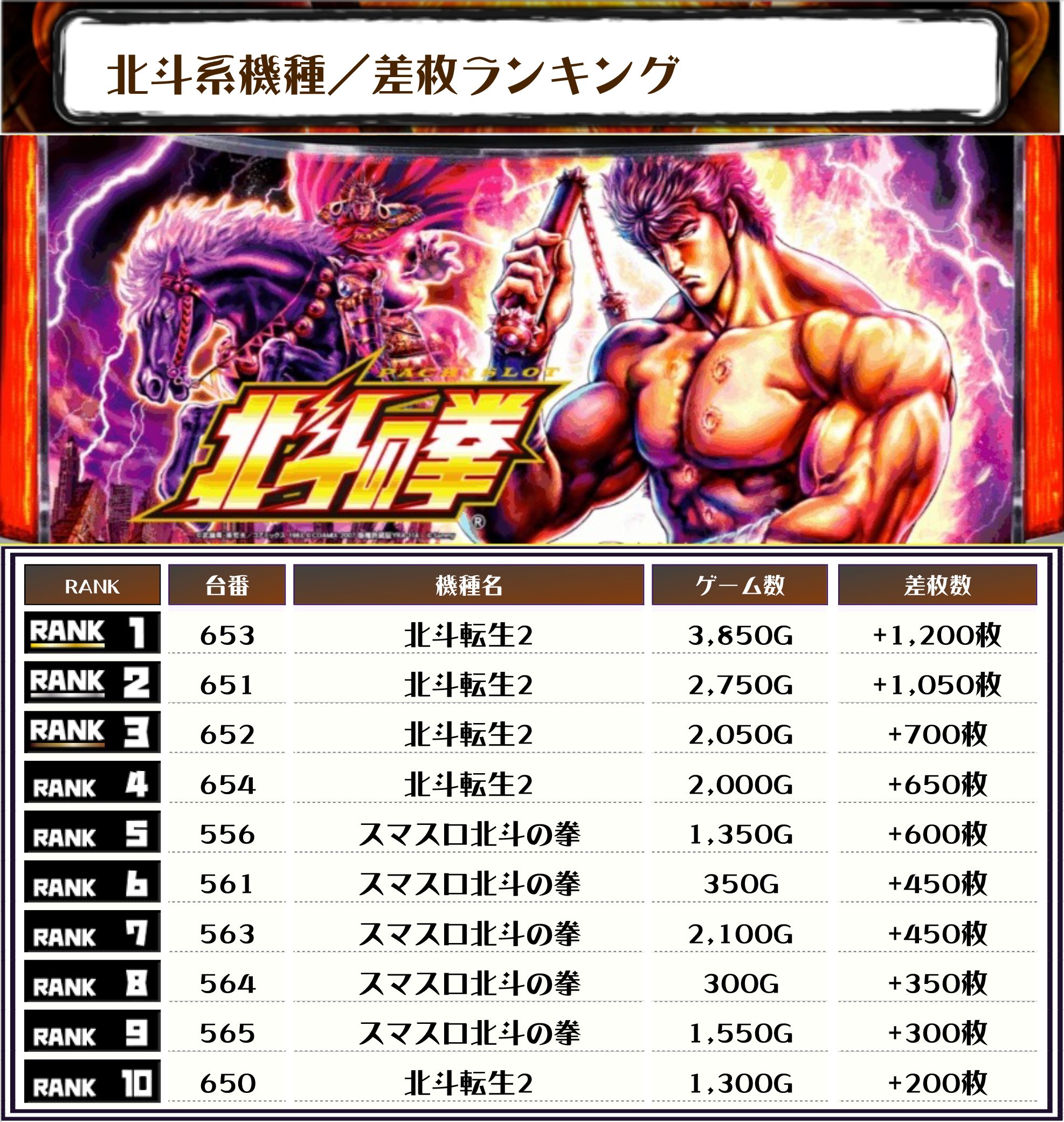 また、2位にも同じく【北斗転生2・651番台】の+1,050枚、そして3位にも【北斗転生2・652番台】の+700枚がランクインしました🏆