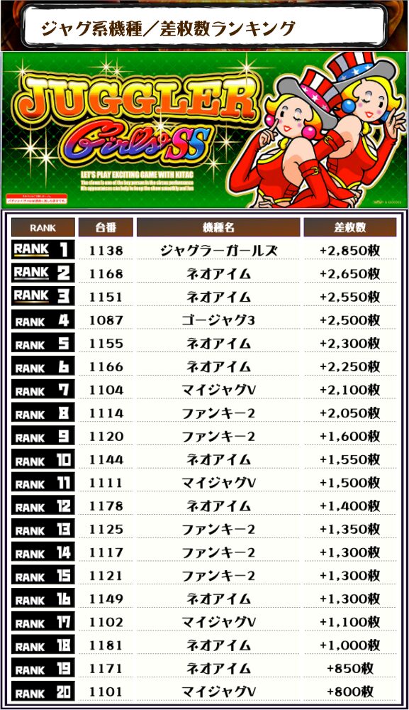 今回は設置台数の少ないジャグラーガールズがTOPとなりました👏