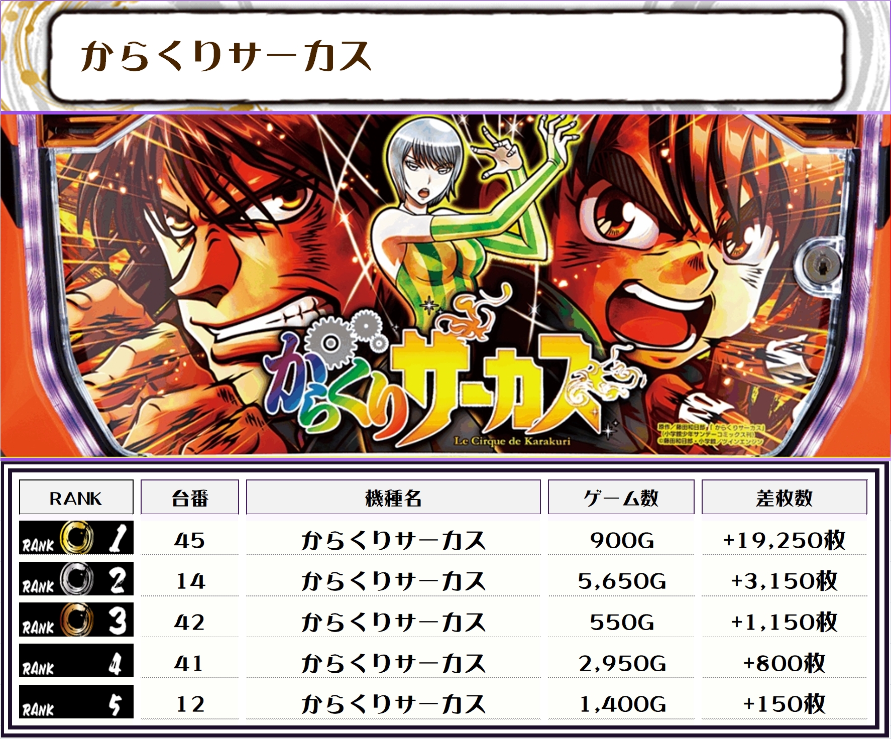 この日の全体差枚トップは【からくりサーカス・45番台】の+19,250枚っ🎉