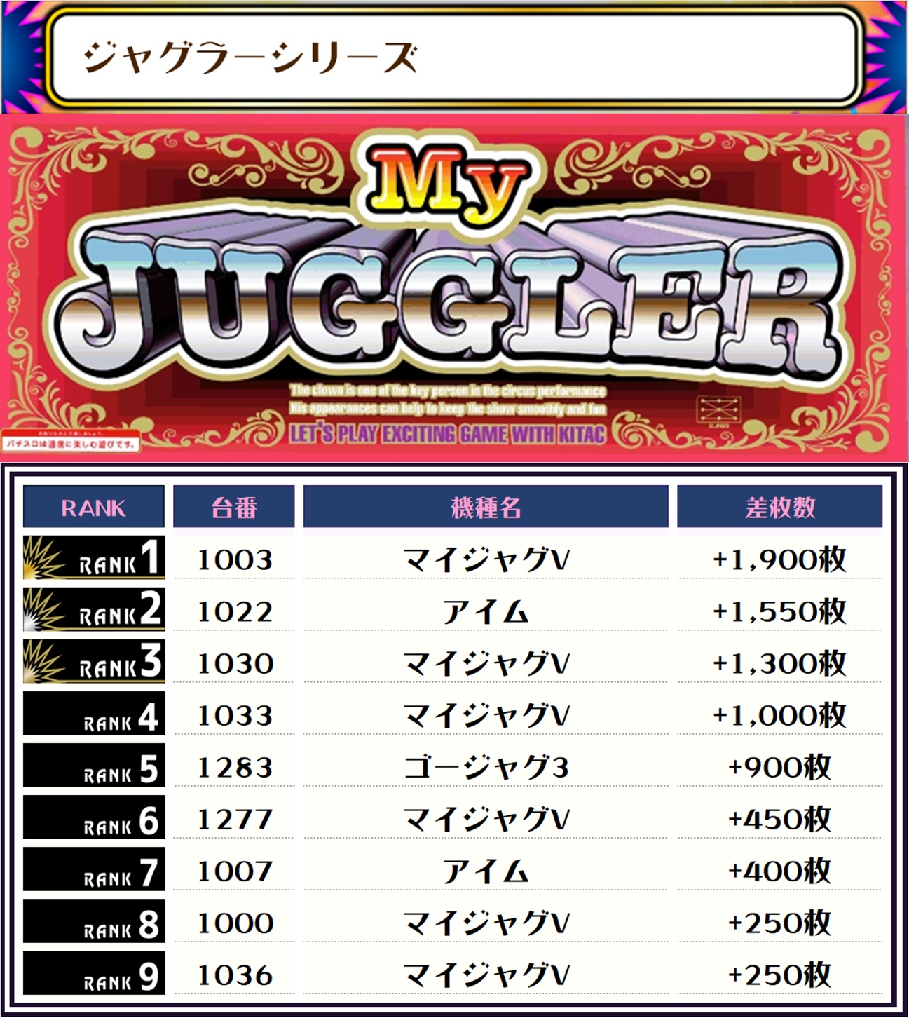 この日のジャグラーシリーズ全体TOPは【マイジャグV・1003番台】で+1,900枚‼️