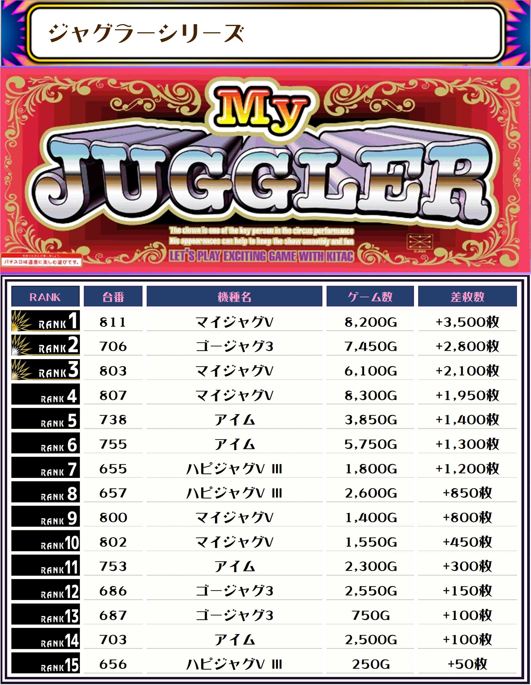 この日のジャグラーシリーズ全体TOPは【マイジャグV・811番台】で+3,500枚‼️