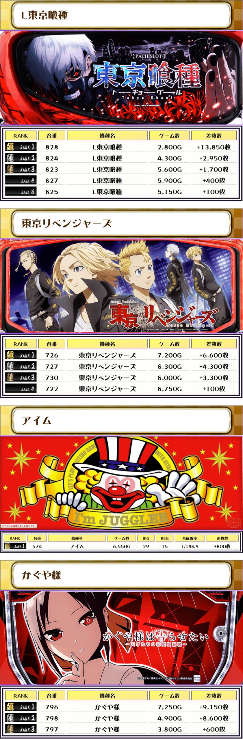 今回、私が気になったのはL東京喰種・東京リベンジャーズの2機種だな👍これらは優秀台の数が多く、半分以上はそうだったんじゃないかと思うっ