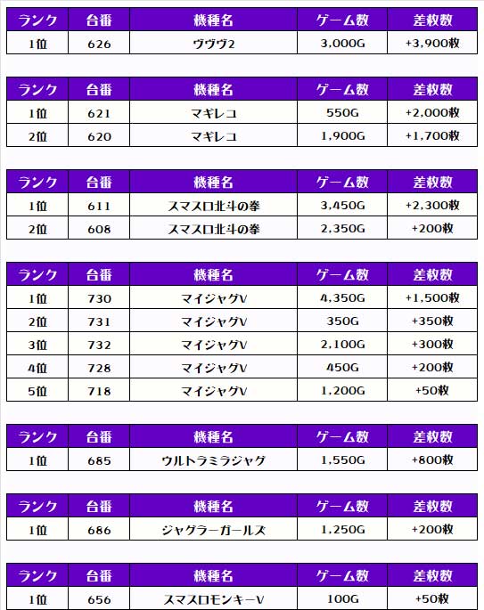 2位には【ヴヴヴ2・626番台】の+3,900枚、そして3位には【ゴージャグ3・700番台】の+3,750枚がランクインしましたっ👾👾👾✨