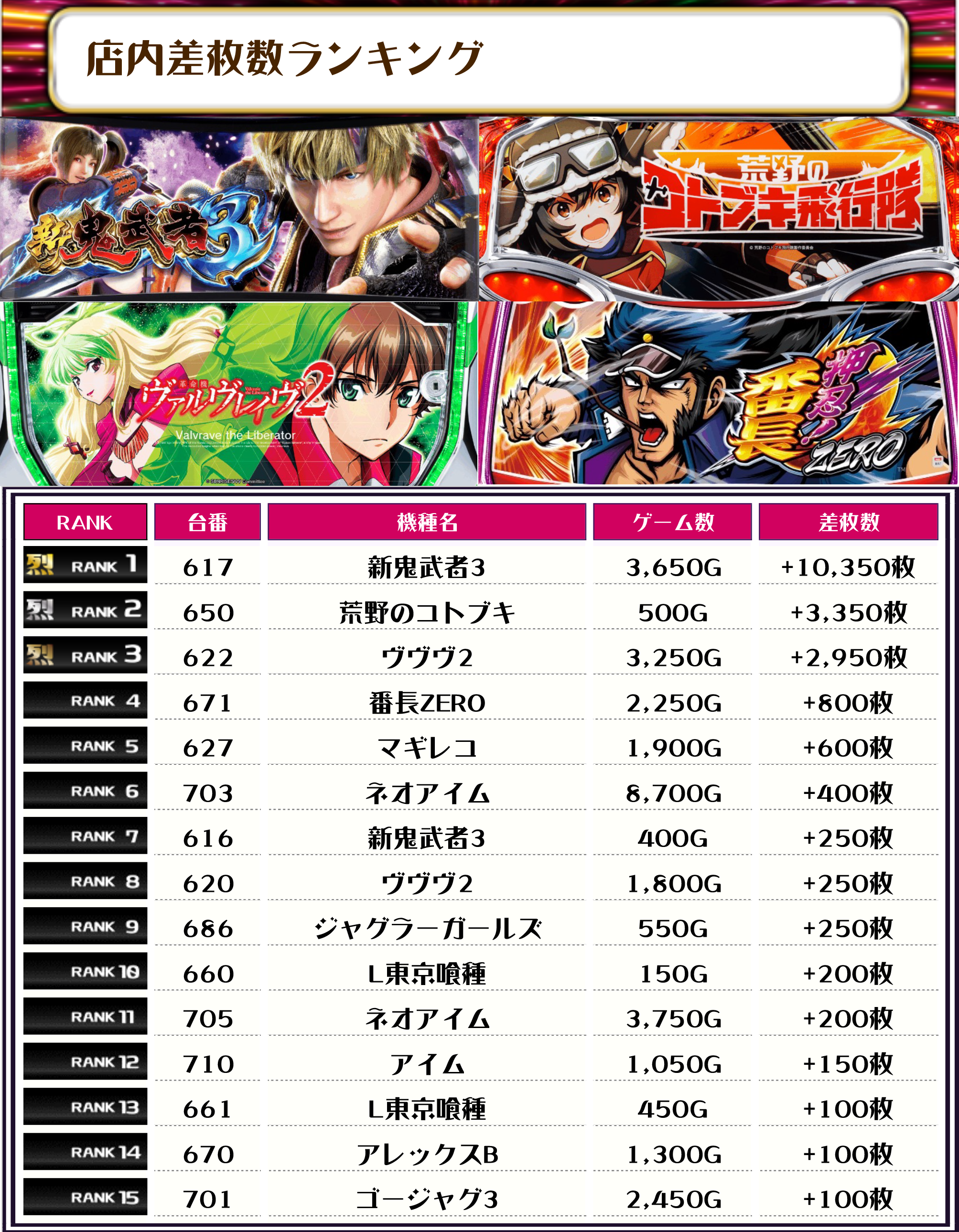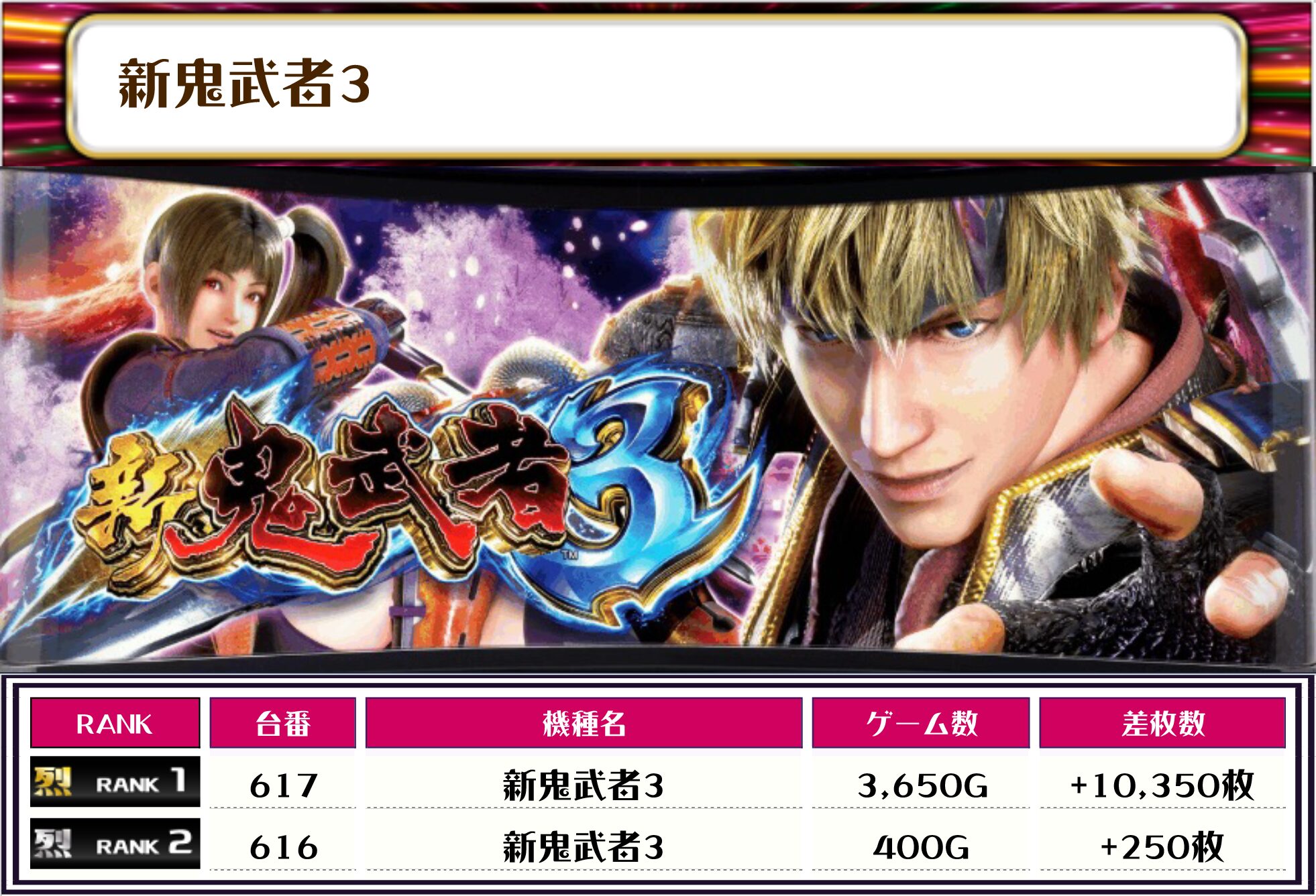 差枚ランキングでTOPに輝いたのは【新鬼武者3・617番台】で+10,350枚‼️