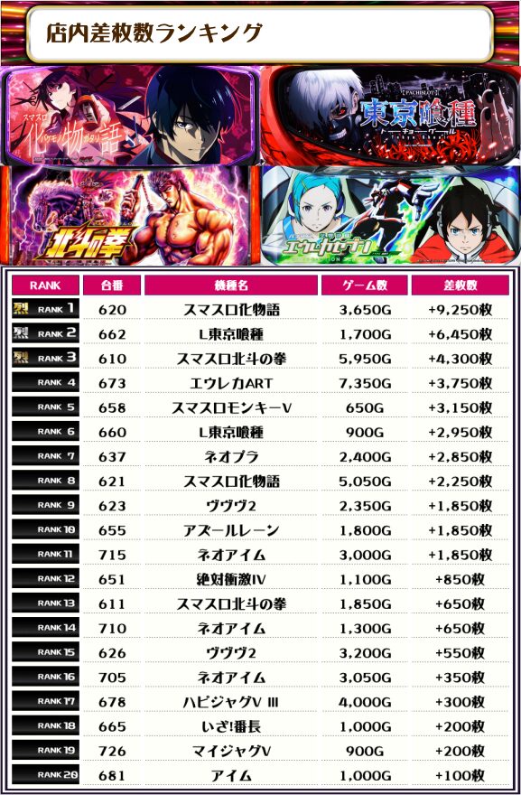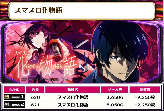 差枚ランキングでTOPに輝いたのは【スマスロ化物語・620番台】で+9,250枚‼️