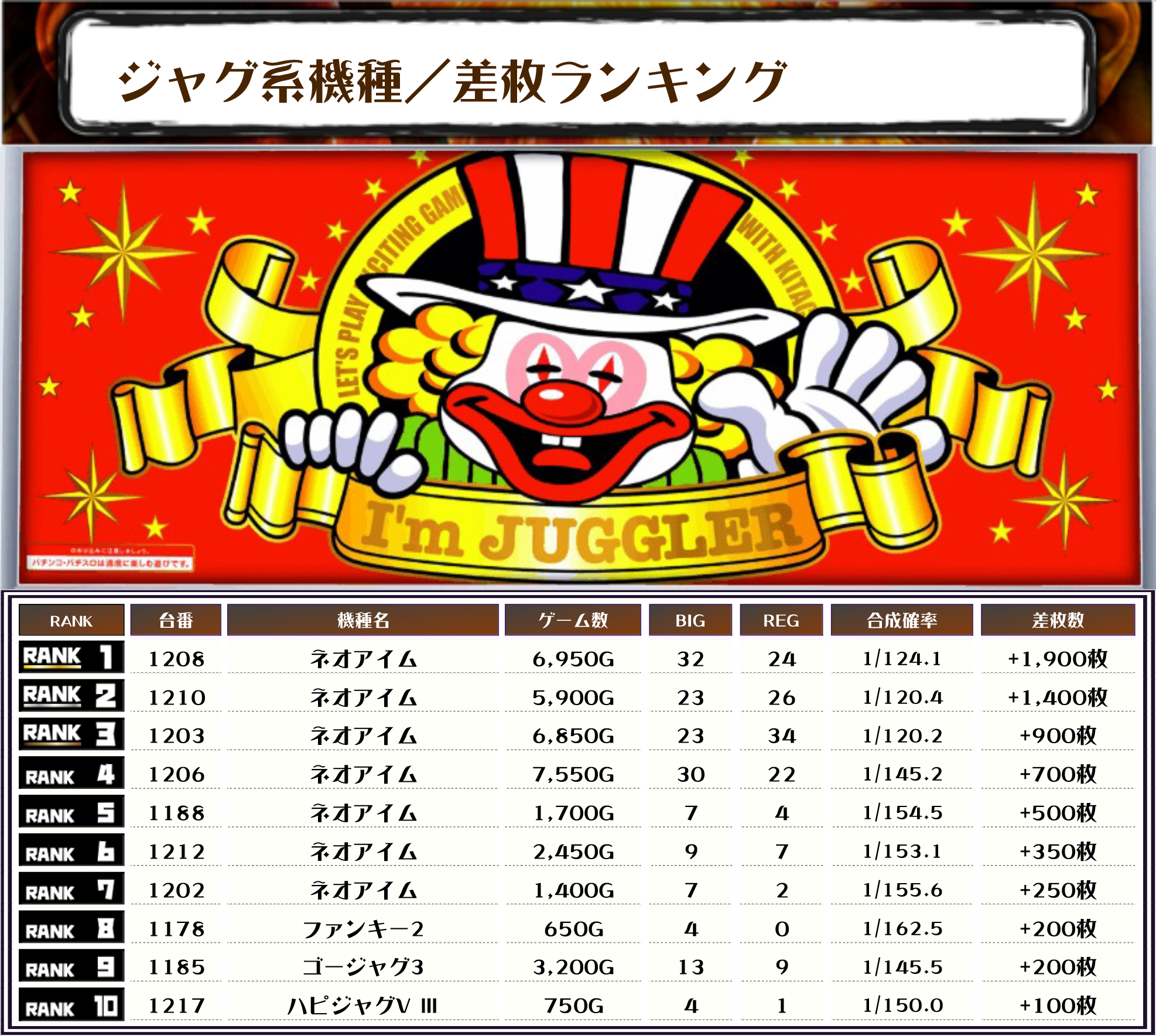 また、2位にも【ネオアイム・1210番台】の+1,400枚、そして3位も【ネオアイム・1203番台】の+900枚がランクインっ👏