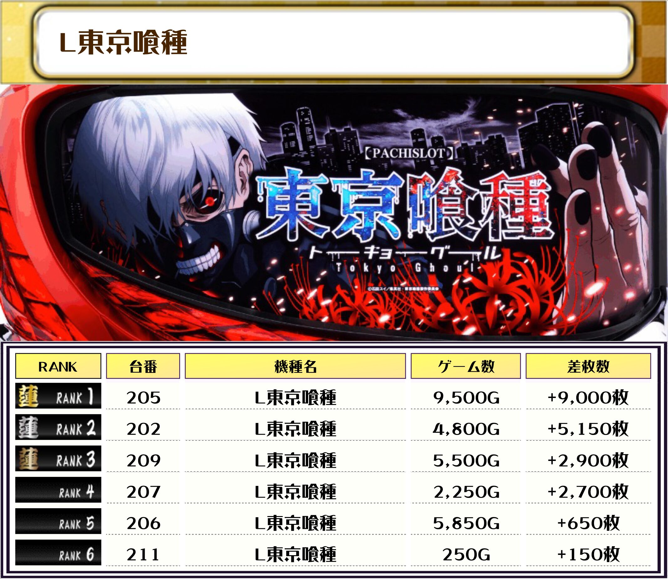 この日、全体の差枚トップに輝いたのは【L東京喰種・205番台】で+9,000枚‼️