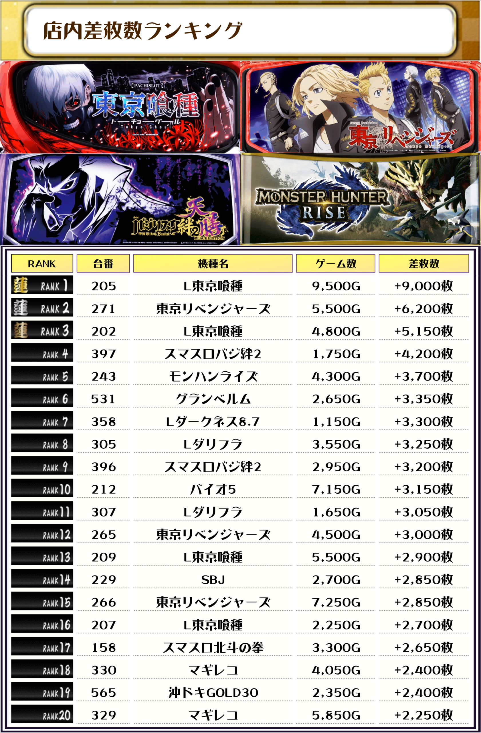 2位には【東京リベンジャーズ・271番台】の+6,200枚、そして3位には【L東京喰種・202番台】の+5,150枚がランクインっ🏆🏆🏆🏆