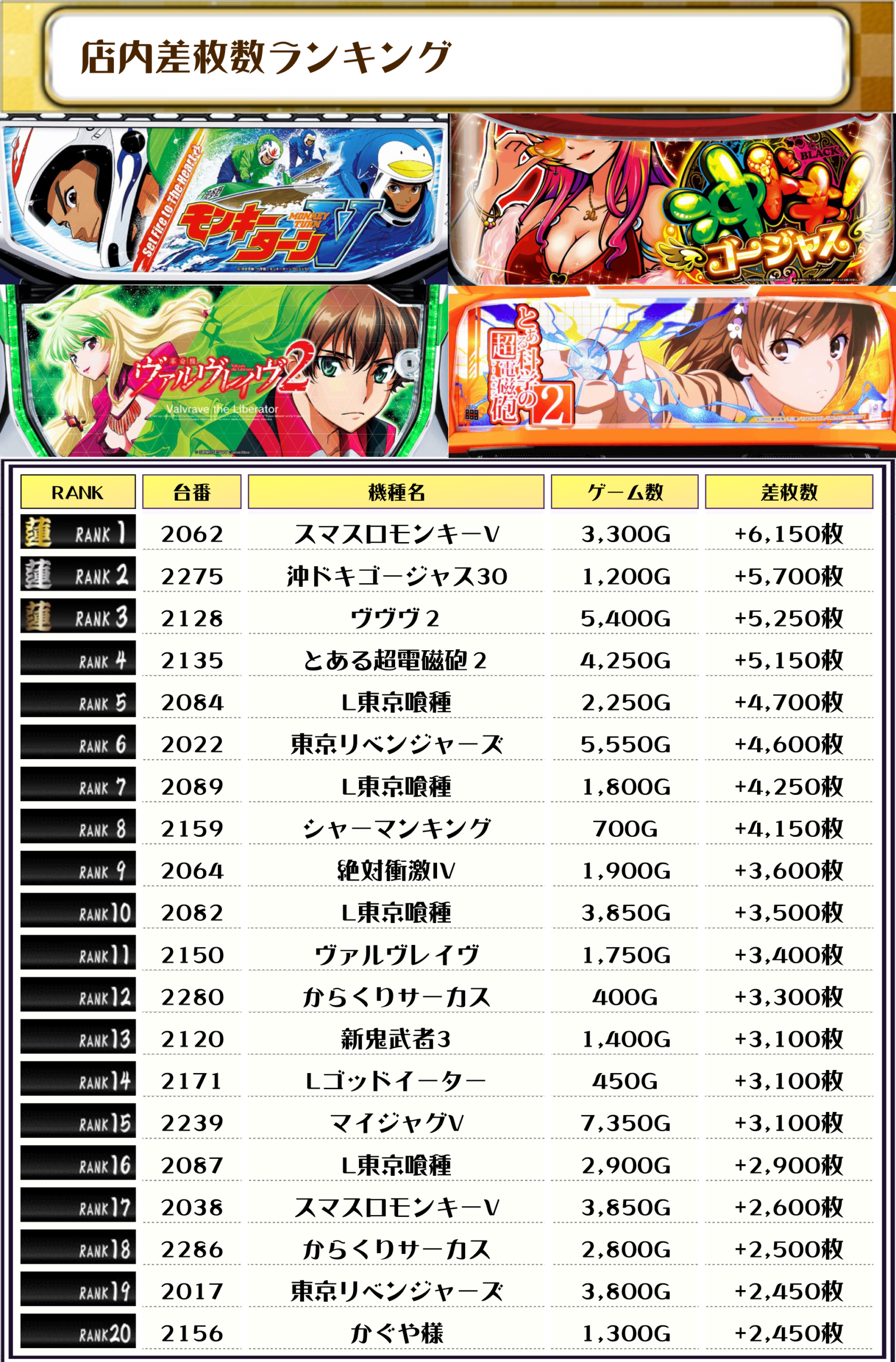 最後に、この日の店内差枚ランキングをご覧ください❗️