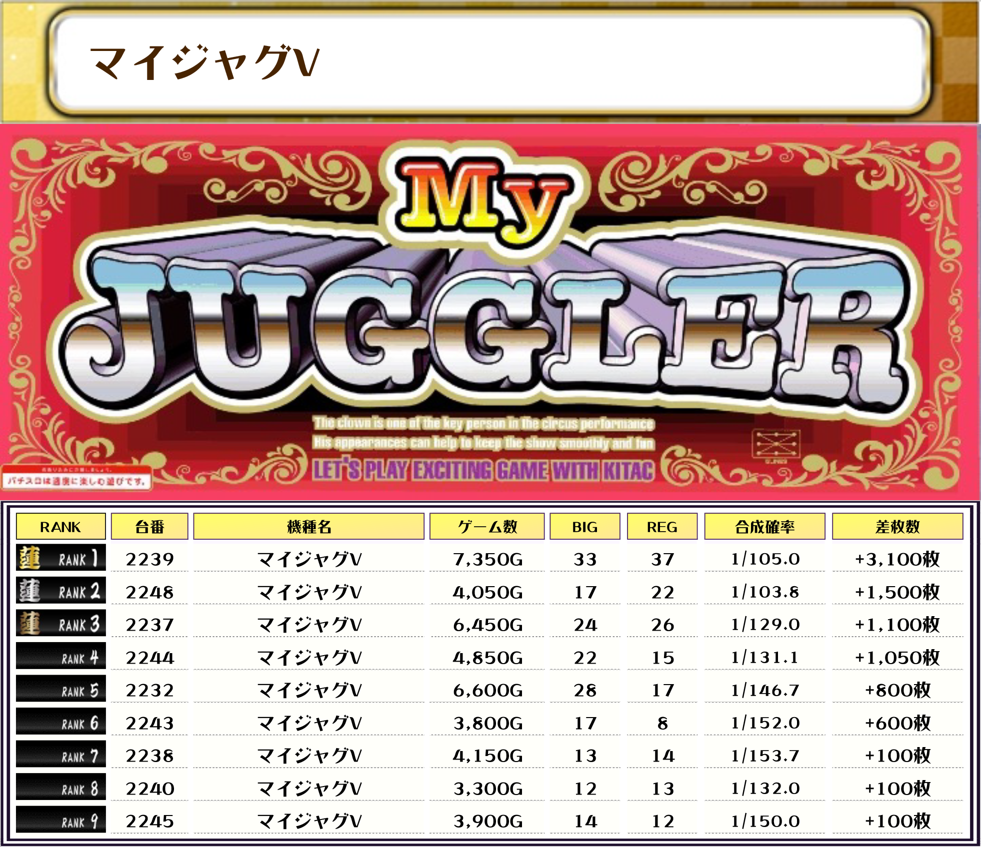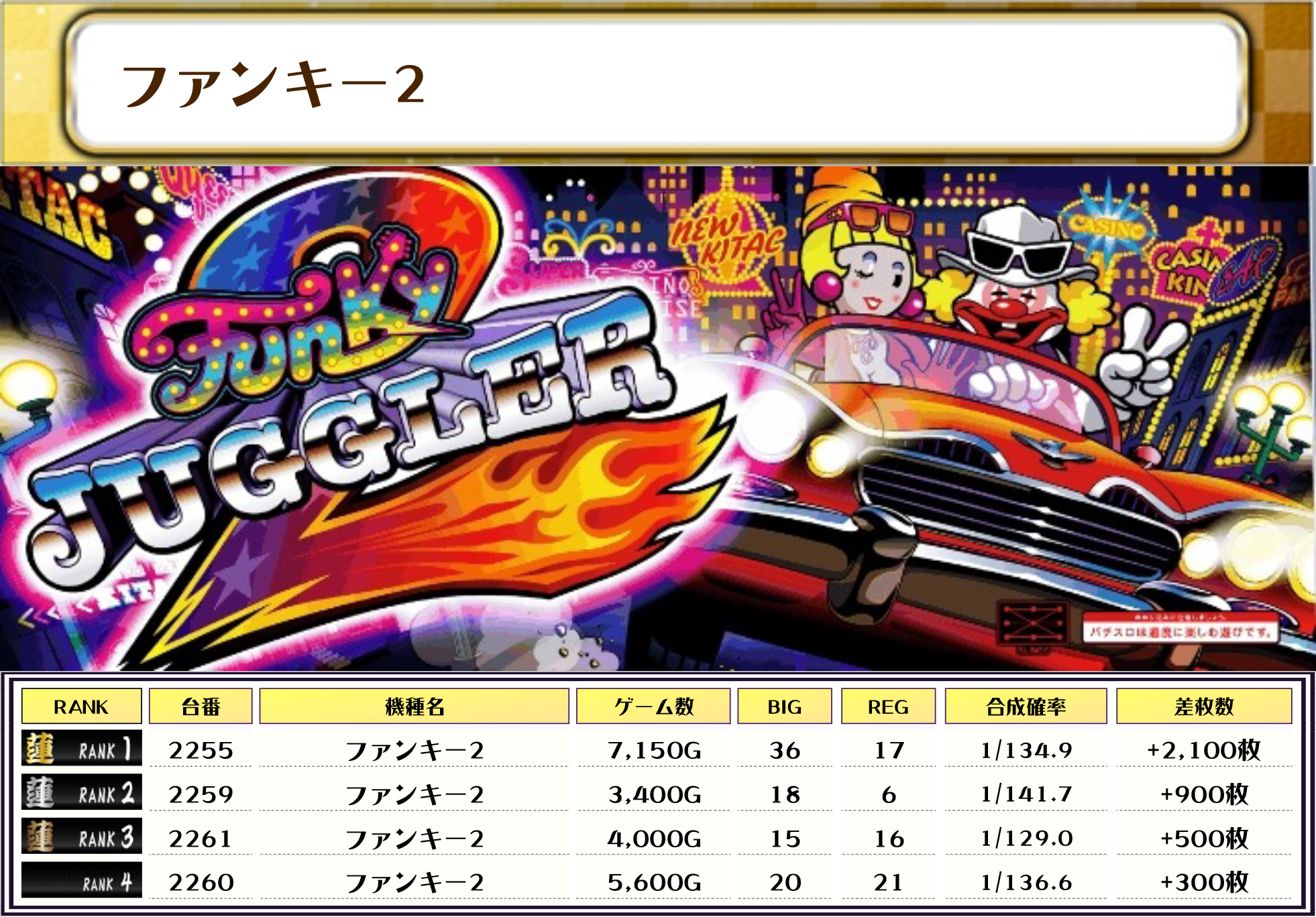 ジャグラー系だと、マイジャグVとファンキー2に優秀台が多く見られましたよ〜👀