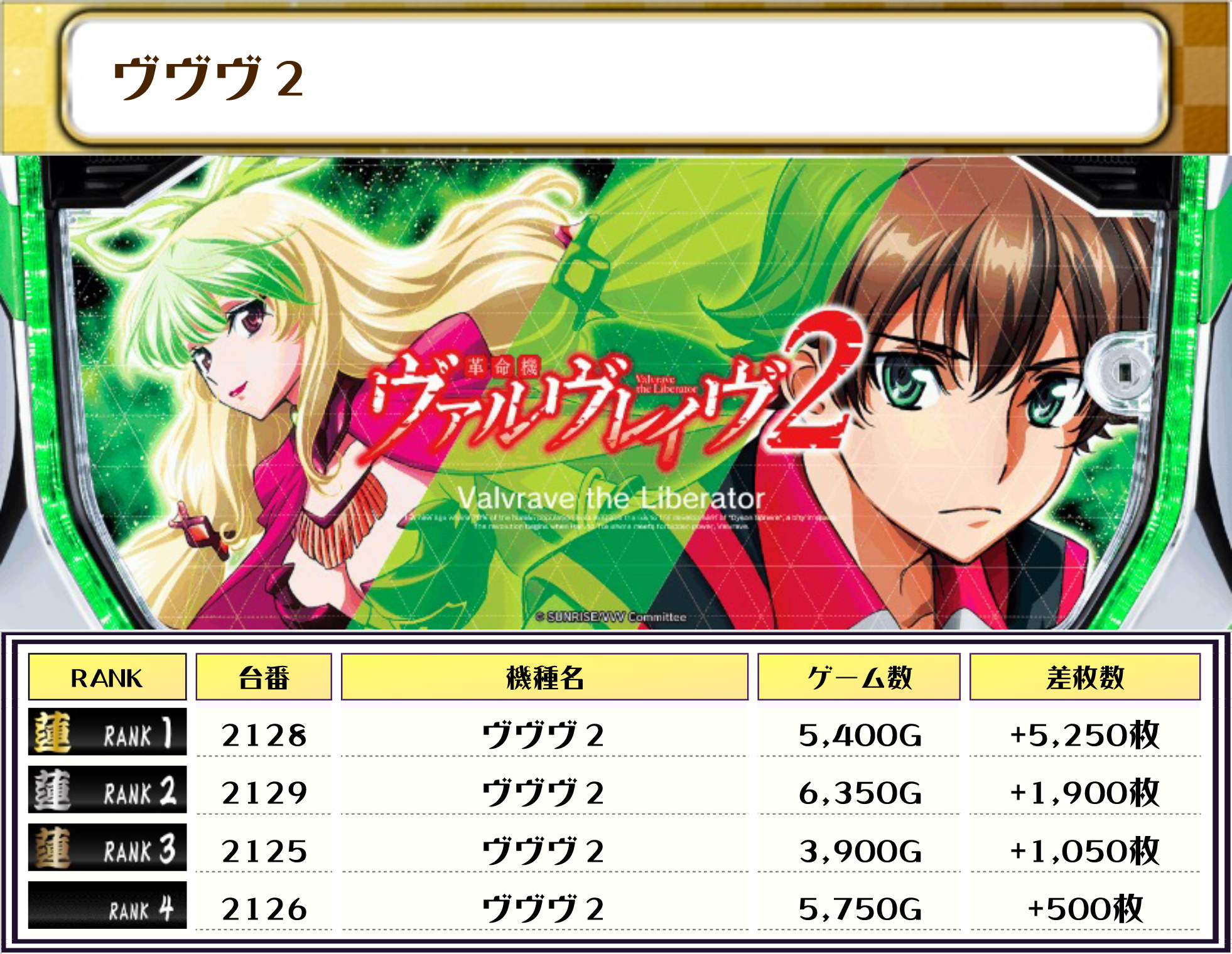 2位には【沖ドキゴージャス30・2275番台】の+5,700枚、そして3位には【ヴヴヴ2・2128番台】の+5,250枚がランクインっ🏆🏆🏆🏆