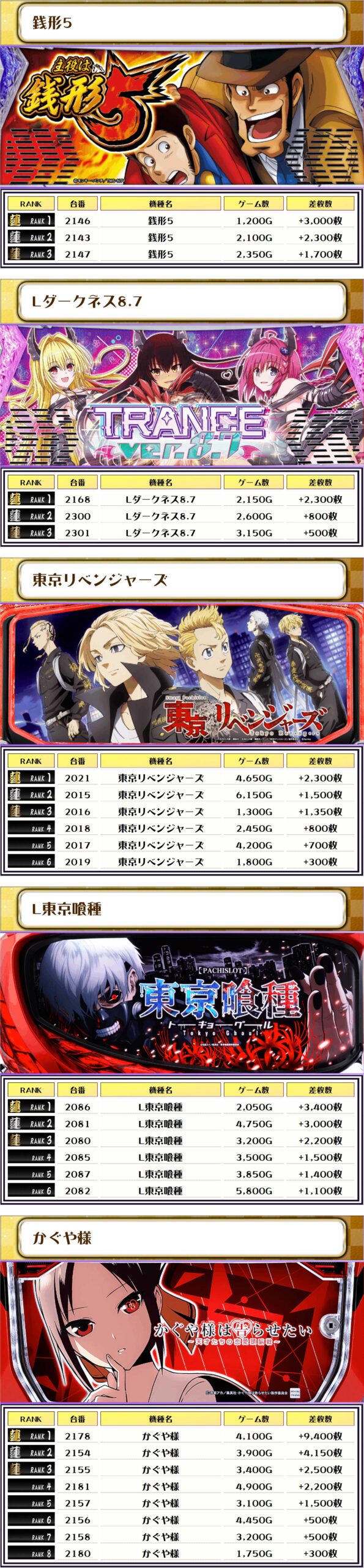 特に、スマスロモンキーⅤ・東京リベンジャーズ・L東京喰種・かぐや様は並んで出ている箇所が多かったような🤔