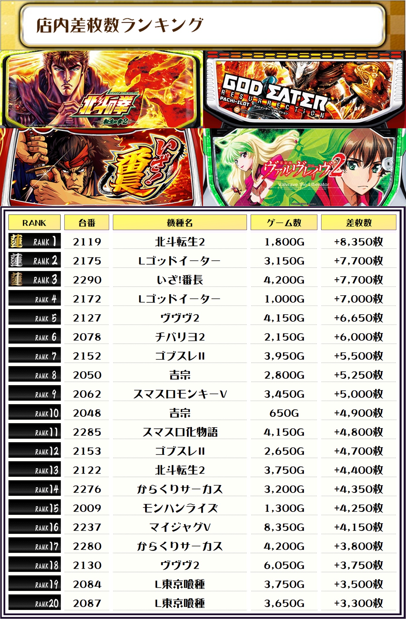 最後に、この日の店内差枚ランキングをご覧ください❗️