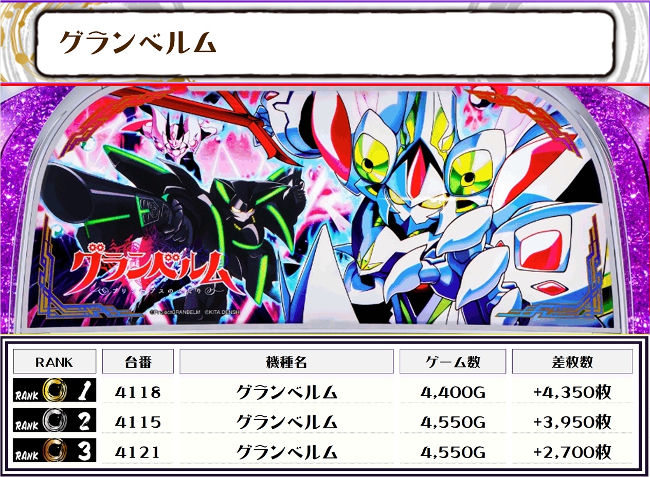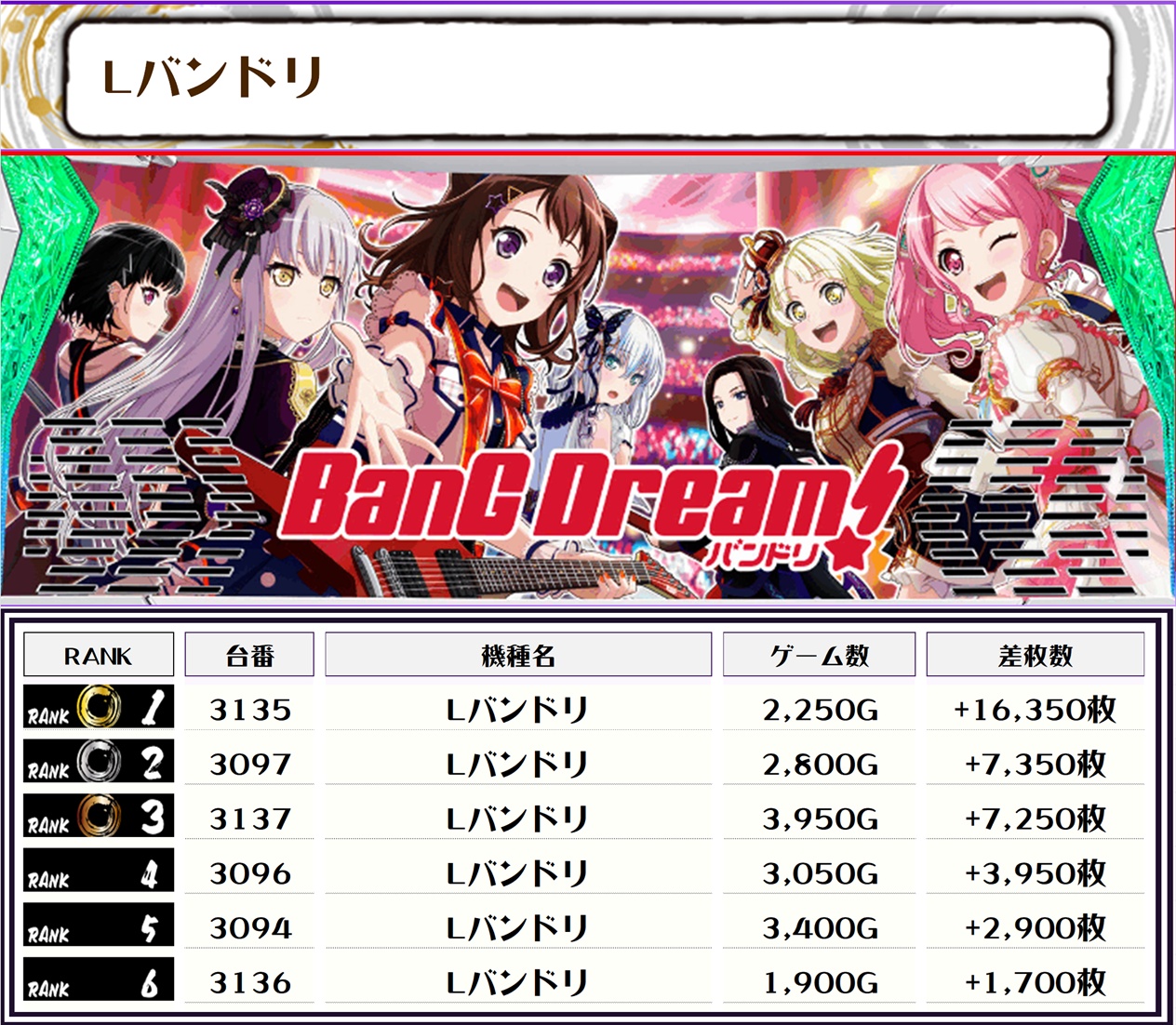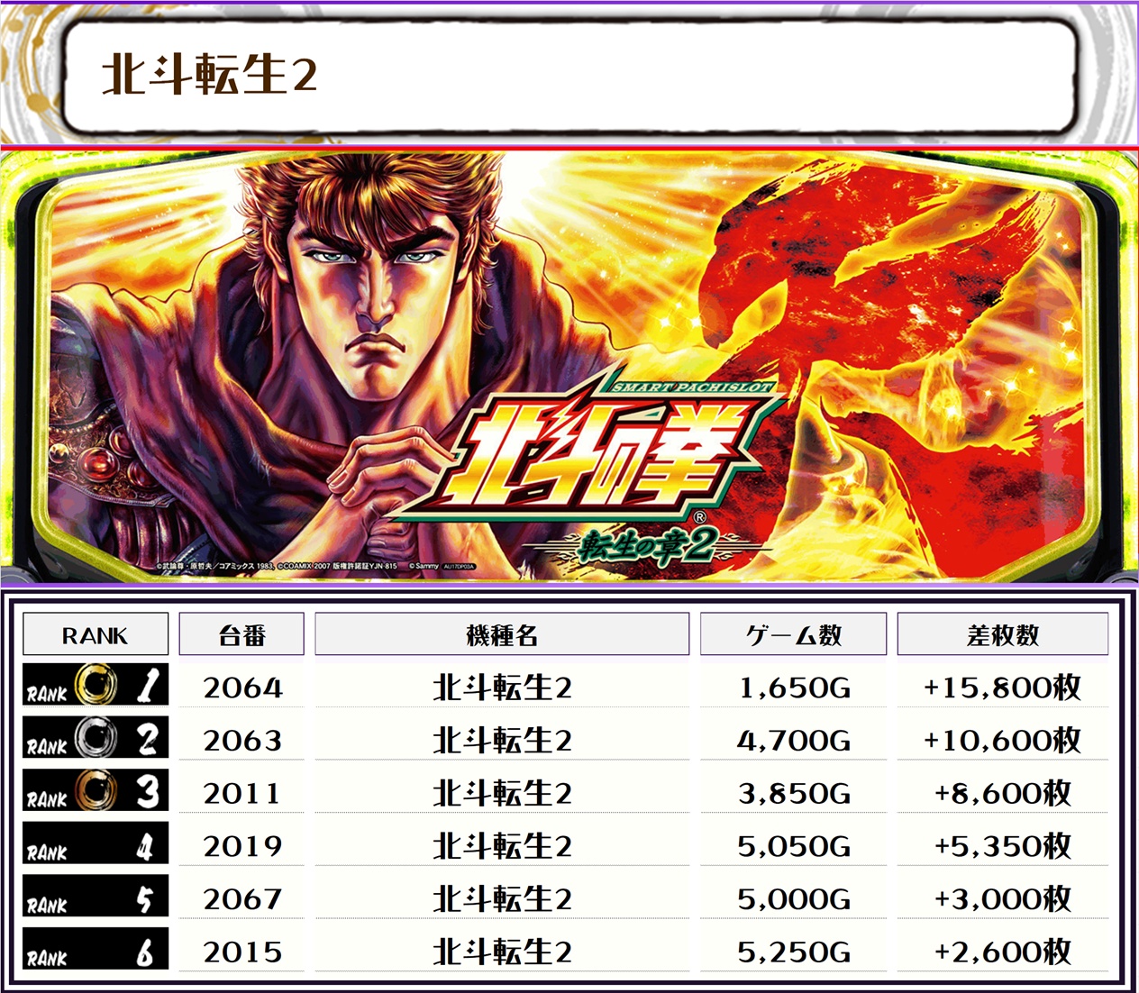 続く2位には【Lバンドリ・3135番台】の+16,350枚、そして3位には【北斗転生2・2064番台】の+15,800枚がランクインっ🏆🏆🏆🏆