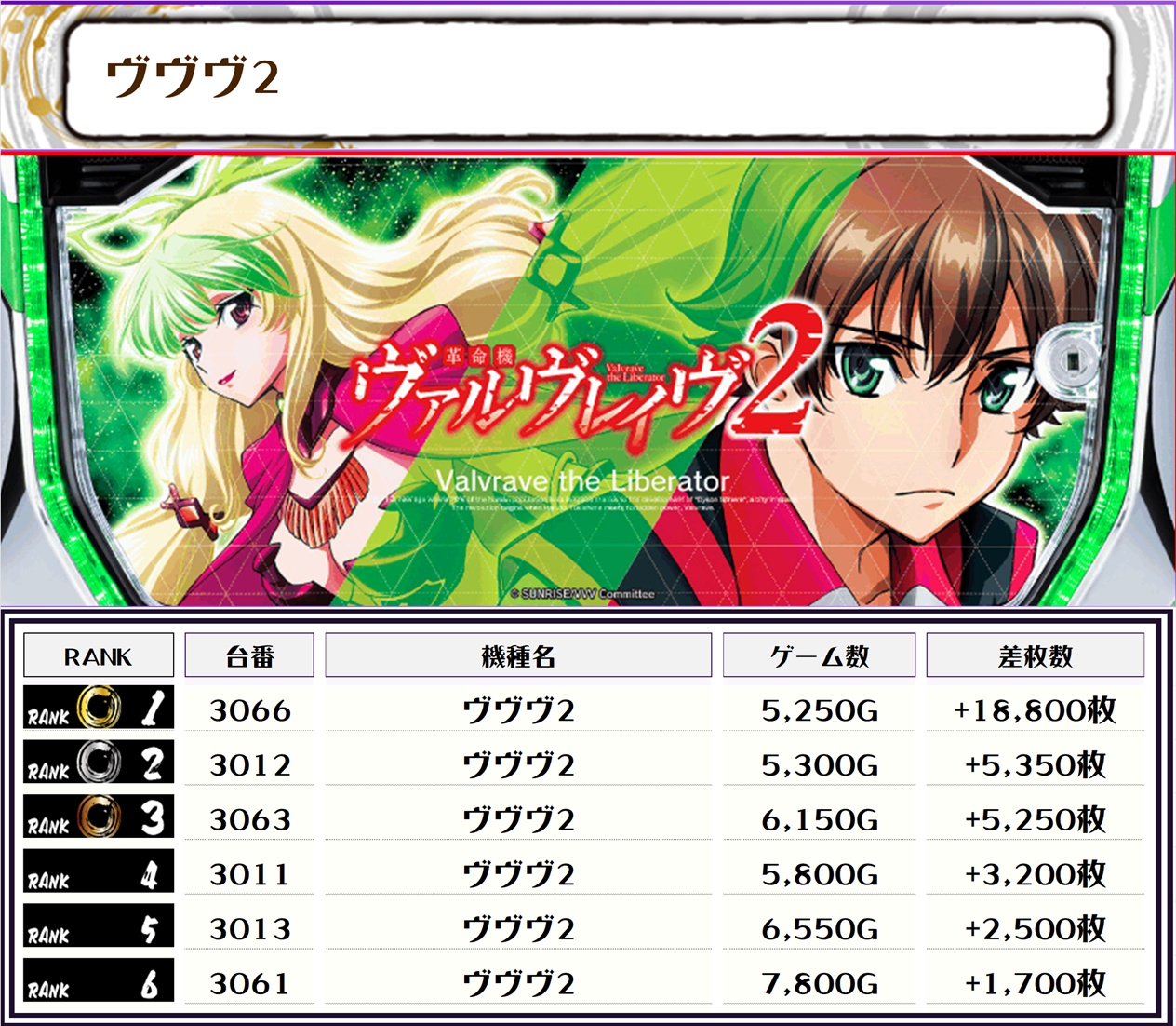 この日、全体の差枚トップに輝いたのは【ヴヴヴ2・3066番台】で+18,800枚‼️