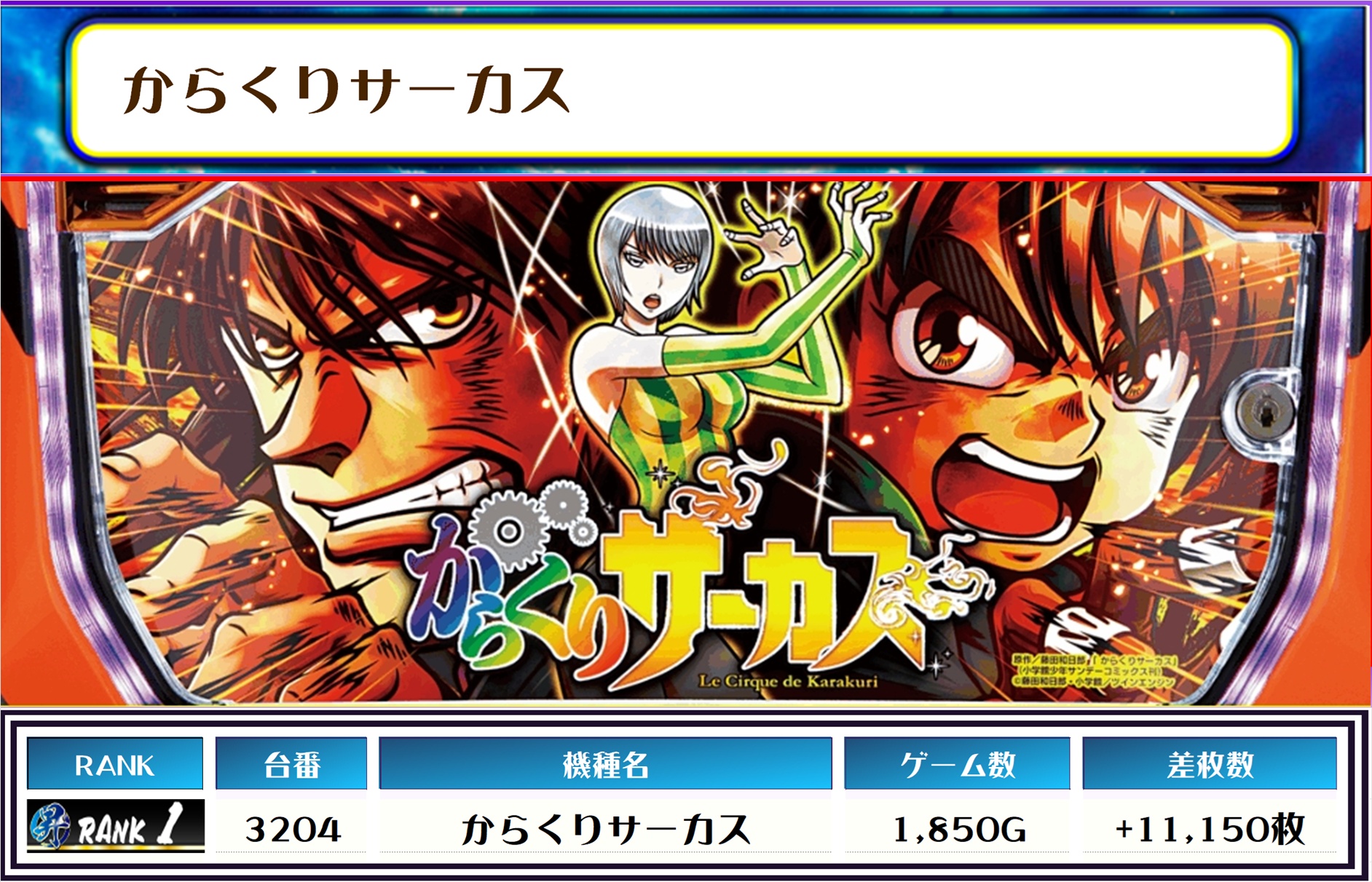 この日、全体の差枚トップに輝いたのは【からくりサーカス・3204番台】の+11,150枚‼️