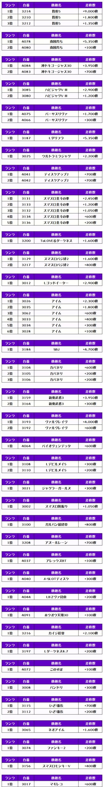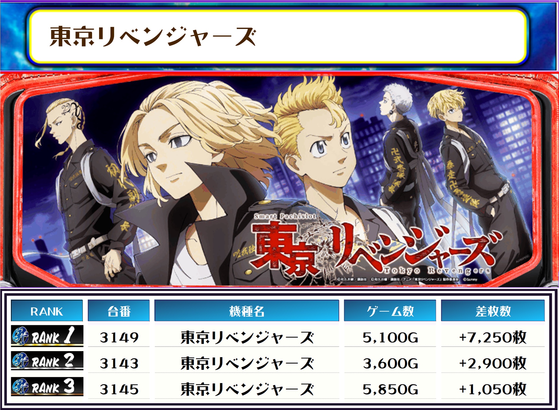2位には【銭形5・3214番台】の+9,000枚、3位には【東京リベンジャーズ・3171番台】の+7,250枚がランクインっ🏆🏆🏆🏆