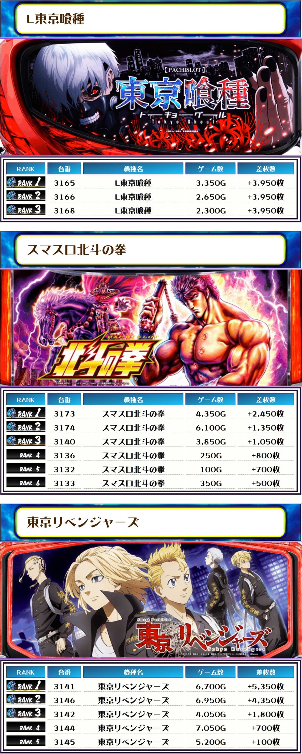 スマスロ北斗の拳と東京リベンジャーズは機種マタギで7台並びの塊があったような気がします🎤