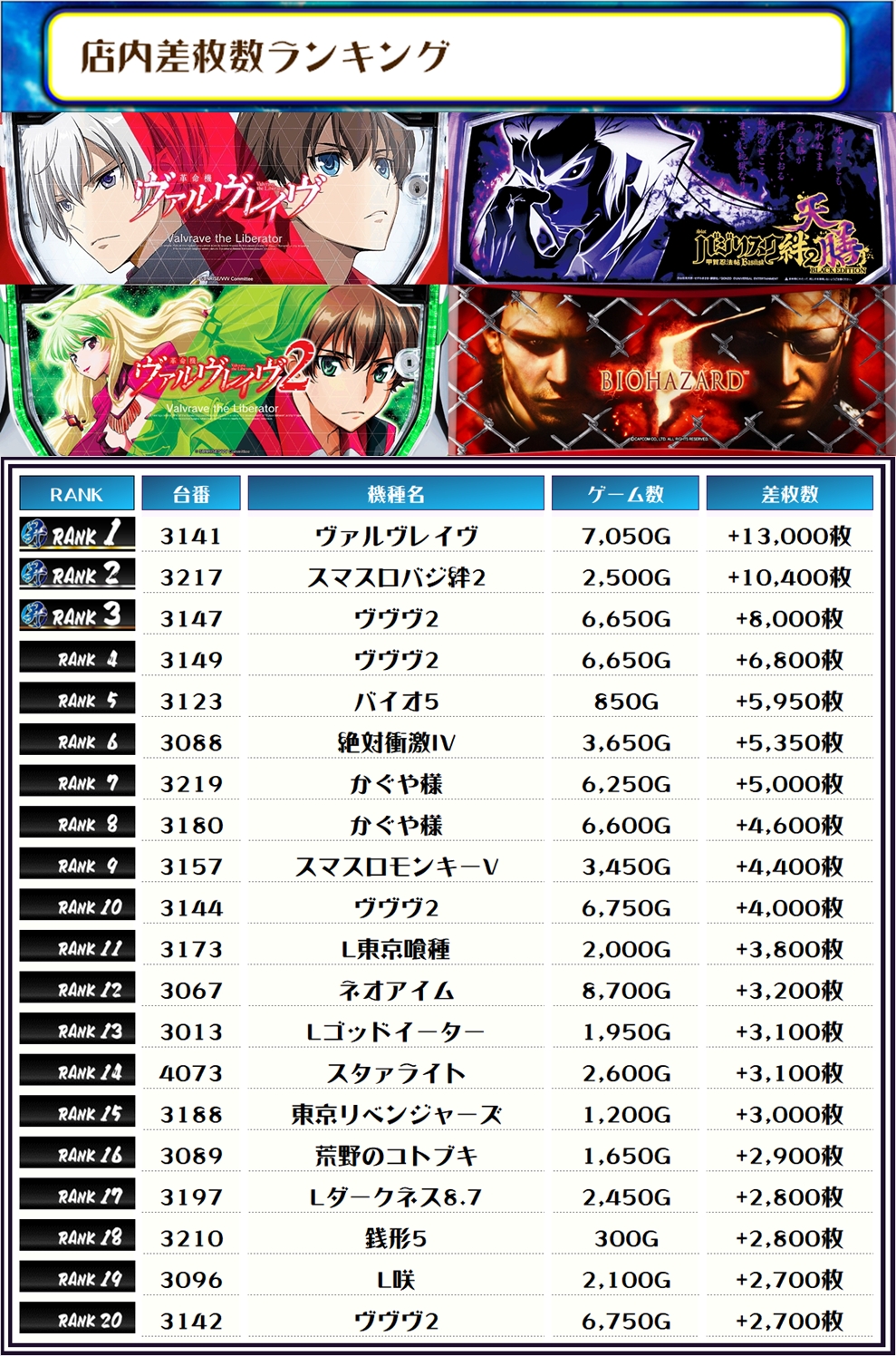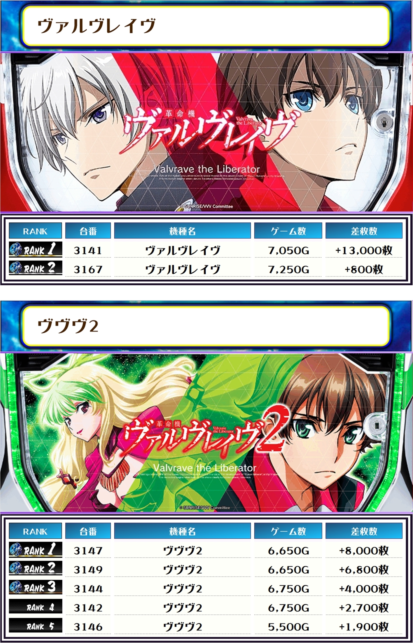 この日、全体の差枚トップに輝いたのは【ヴァルヴレイヴ・3141番台】で+13,000枚👍🎉🎉