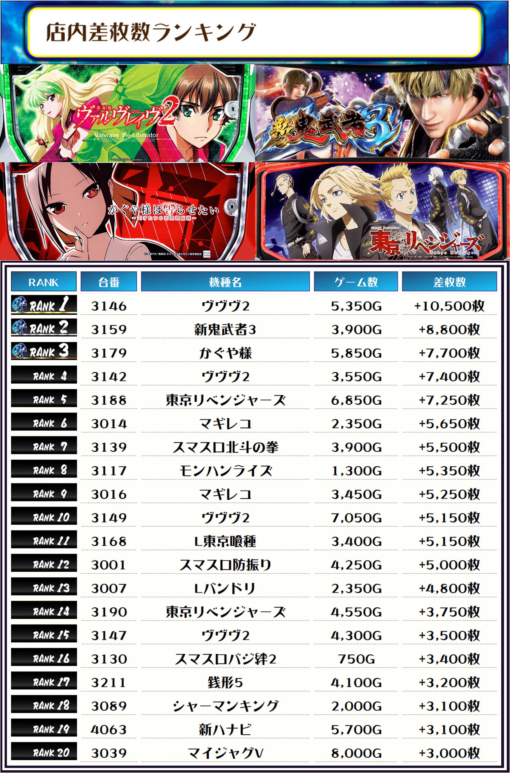 続く2位には【新鬼武者3・3159番台】の+8,800枚、そして3位には【かぐや様・3179番台】の+7,700枚がランクインっ🏆🏆🏆🏆