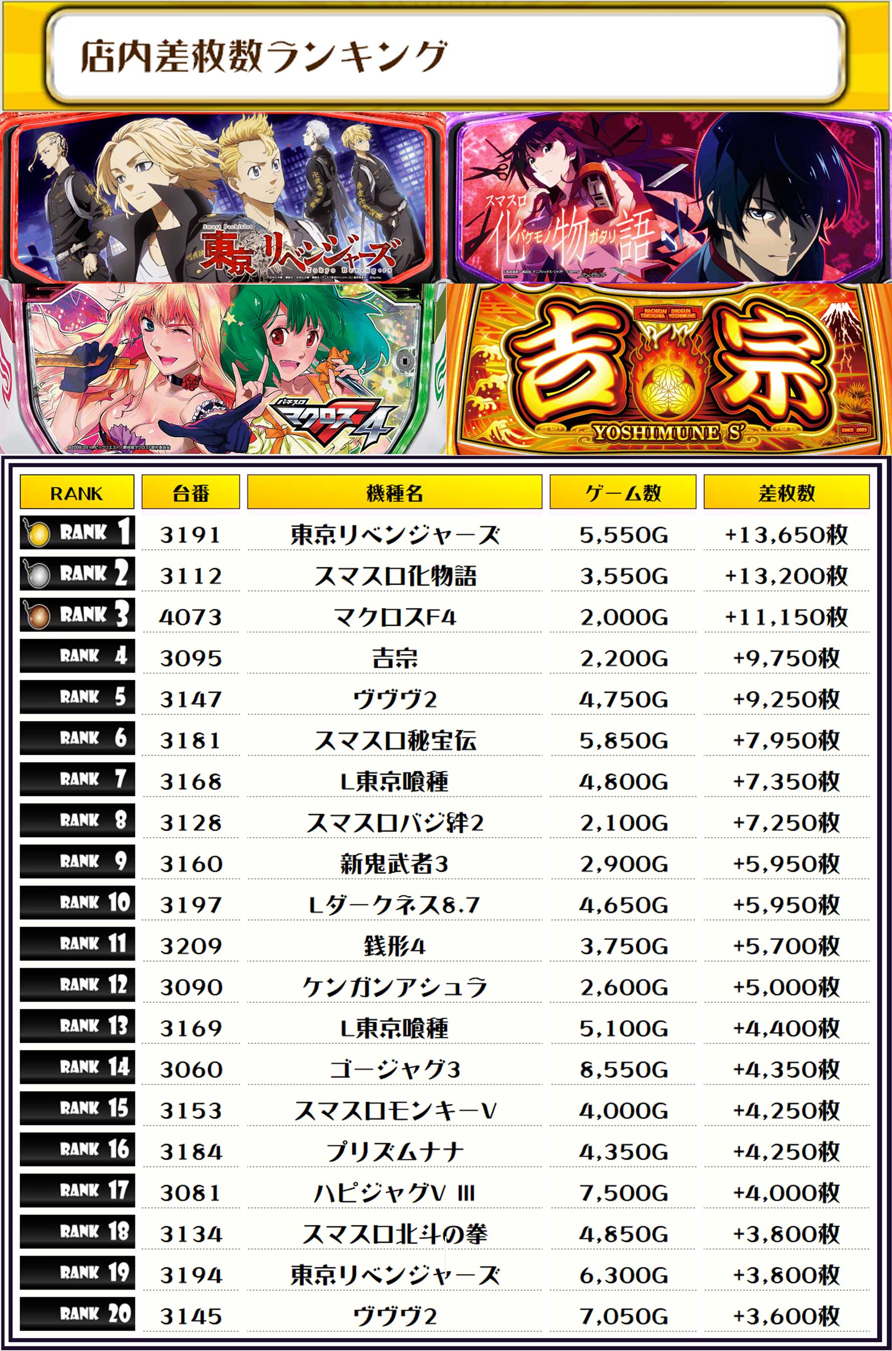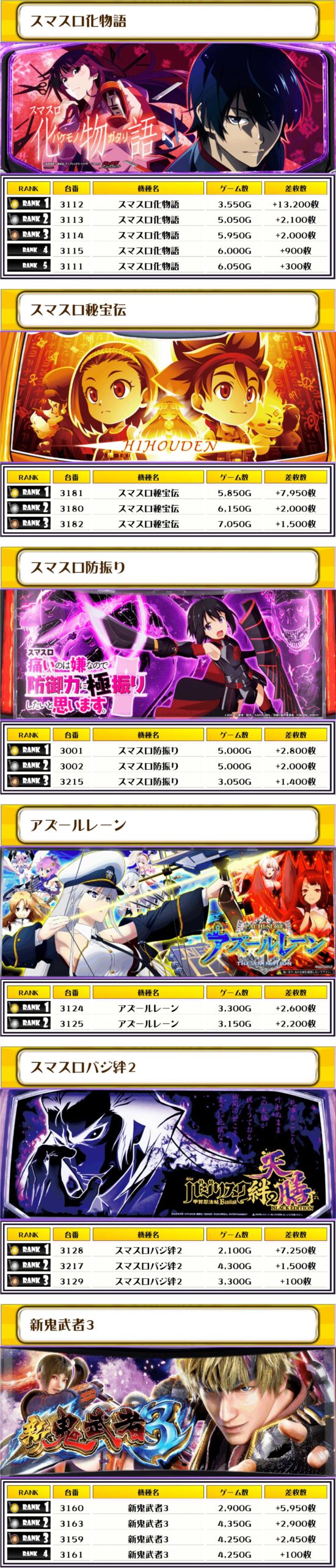 続く2位には【スマスロ化物語・3112番台】の+13,200枚、そして3位には【マクロスF4・4073番台】の+11,150枚がランクインっ🏆🏆🏆🏆