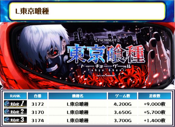 この日、全体の差枚トップに輝いたのは【L東京喰種・3172番台】の+9,000枚‼️
