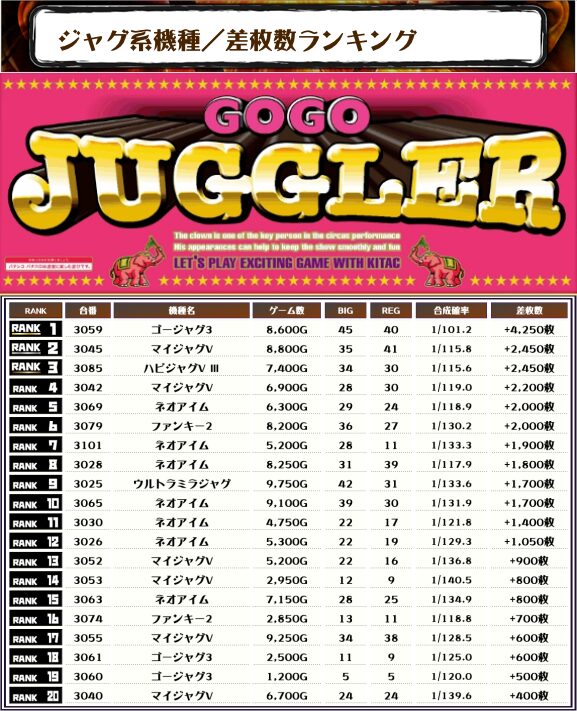 また、2位には【マイジャグ3・3045番台】の+2,450枚、そして3位には【ハピジャグV Ⅲ・3085番台】の+2,450枚がランクインしました🏆