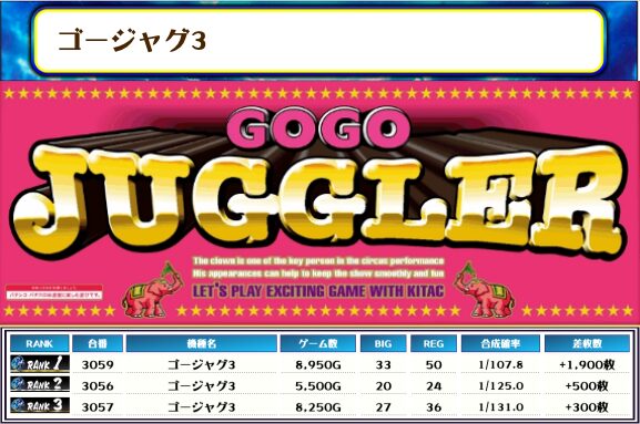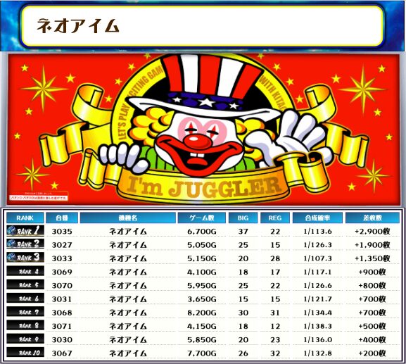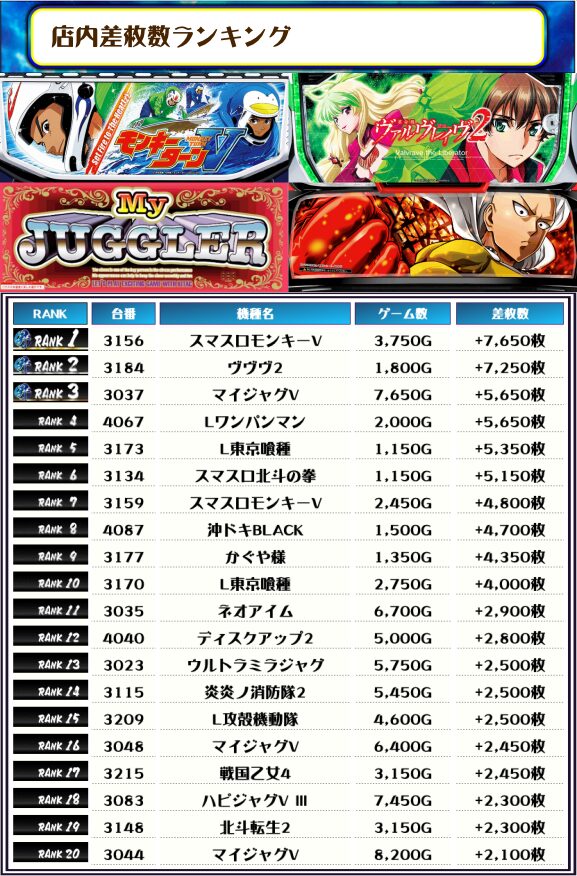 2位には【ヴヴヴ2・3184番台】の+7,250枚、3位には【マイジャグV・3037番台】の+5,650枚がランクインっ🏆🏆🏆🏆