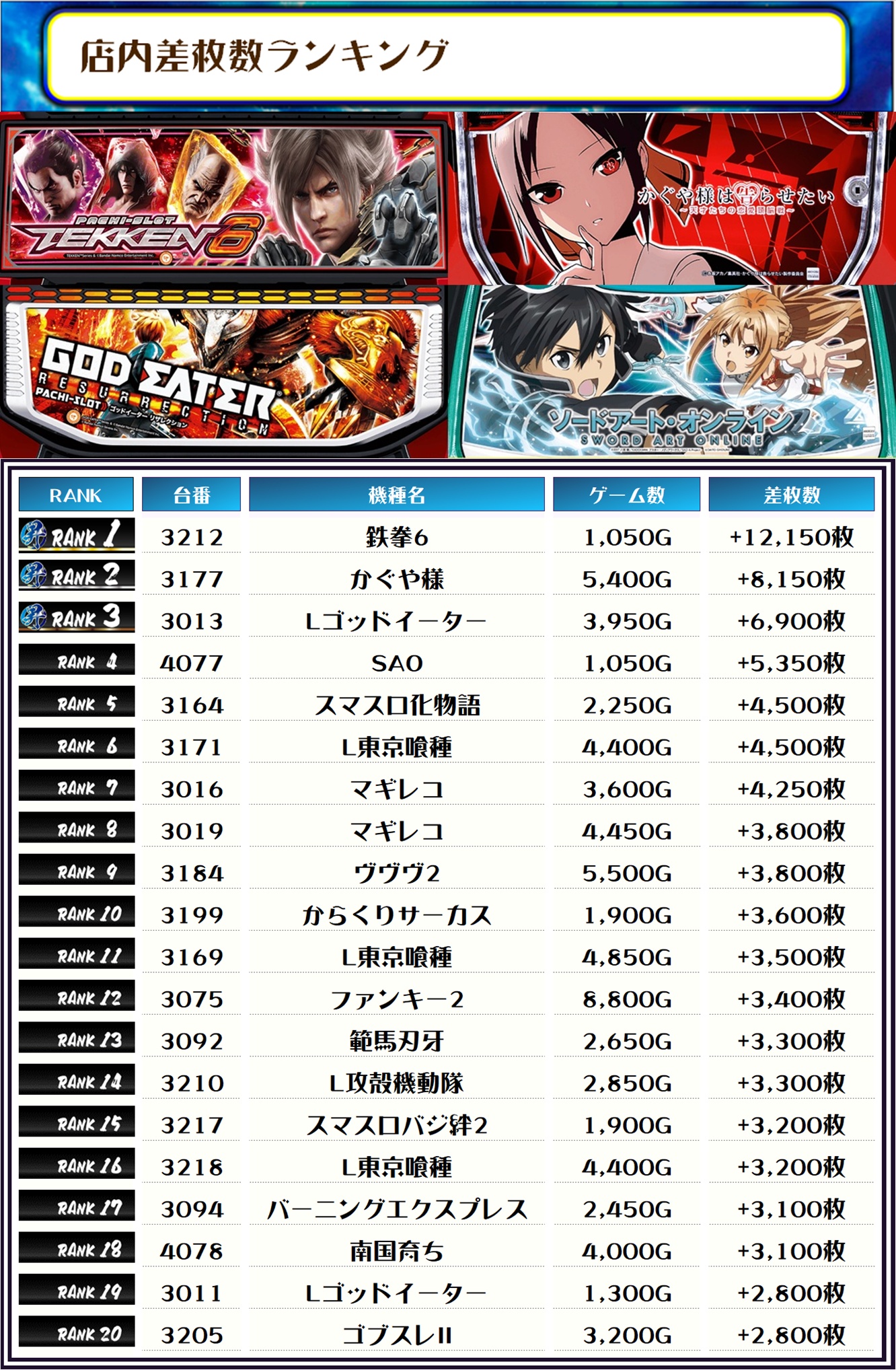 それでは、この日の【機種別差枚ランキング】を見ていきましょう❗️