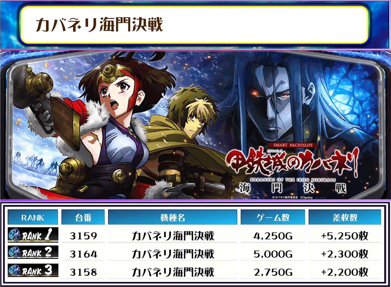 この日、全体の差枚トップに輝いたのは【カバネリ海門決戦・3159番台】の+5,250枚‼️