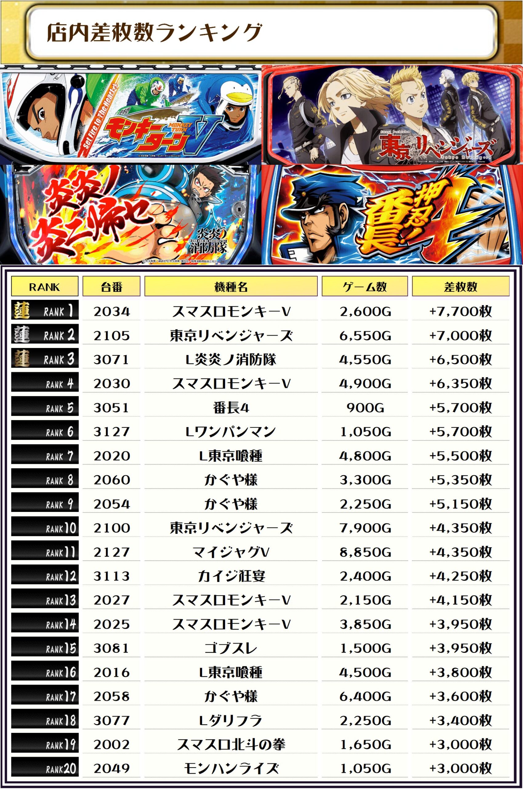 2位には【東京リベンジャーズ・2105番台】の+7,000枚、そして3位には同率で【L炎炎ノ消防隊・3071番台】の+6,500枚がランクインっ🏆🏆🏆