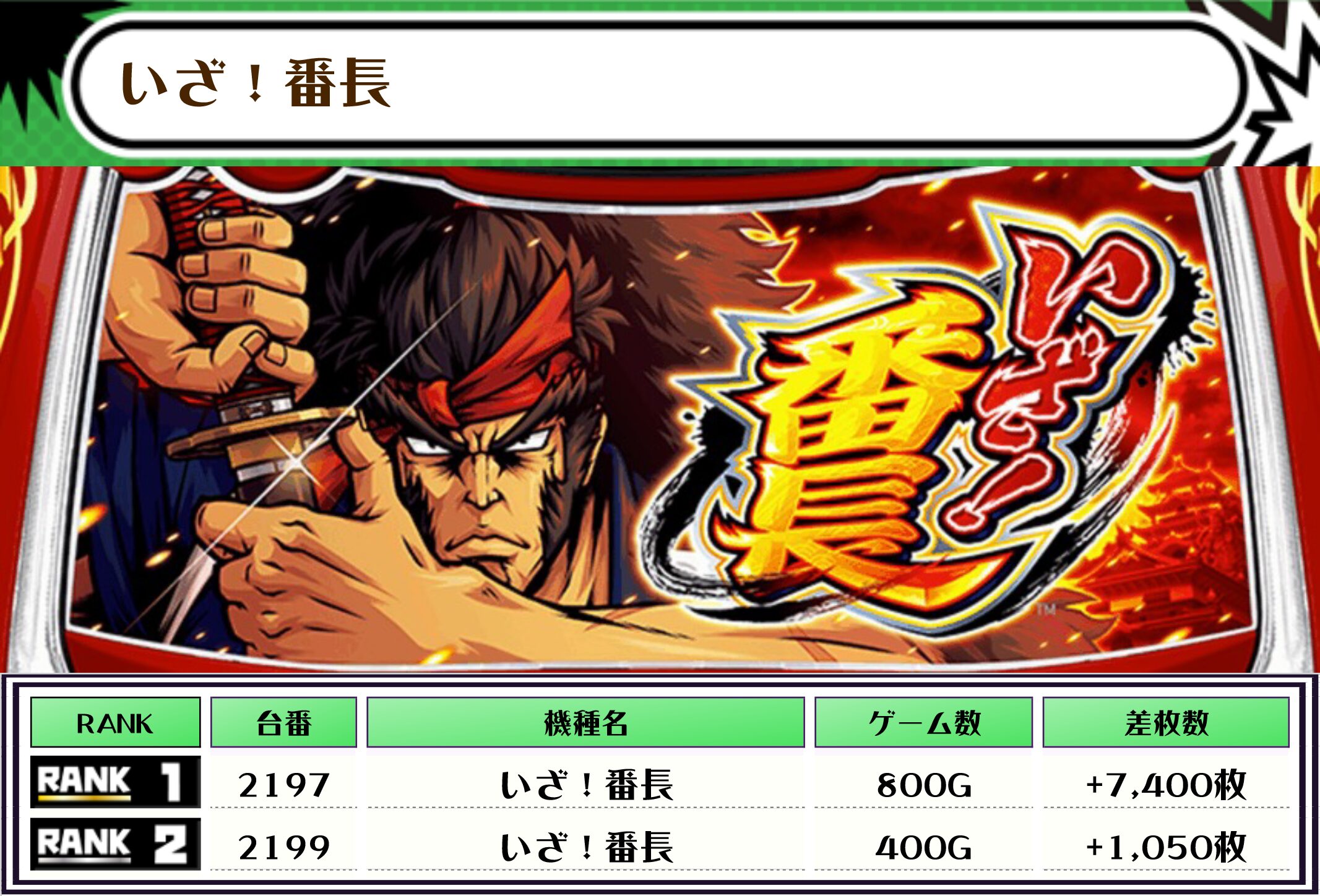 この日、全体の差枚トップに輝いたのは【いざ!番長・2197番台】の+7,400枚‼️