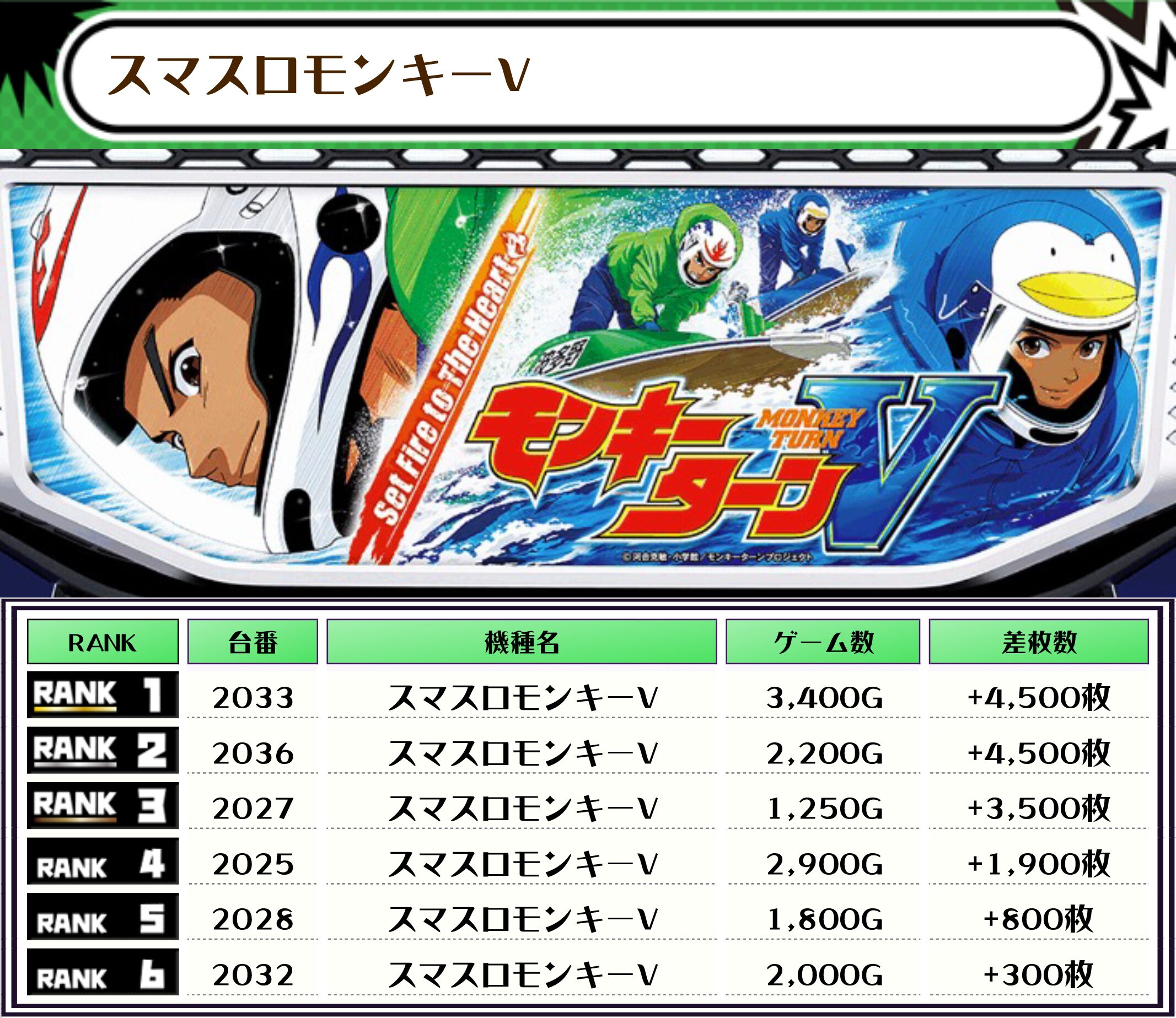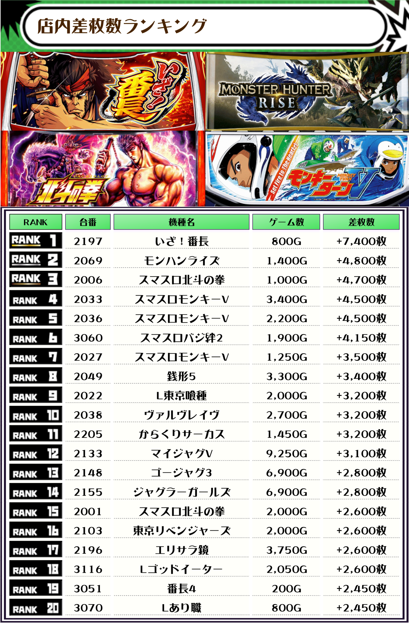 2位には【モンハンライズ・2069番台】の+4,800枚、3位は【スマスロ北斗の拳・2006番台】の+4,700枚がランクインっ🏆🏆🏆🏆
