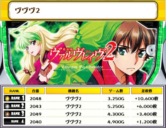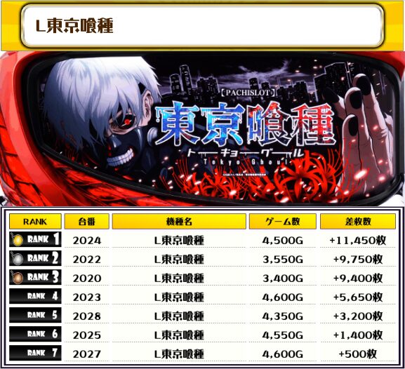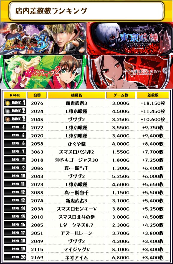 続く2位には【L東京喰種・2024番台】の+11,450枚、そして3位には【ヴヴヴ2・2048番台】の+10,600枚がランクインっ‼️