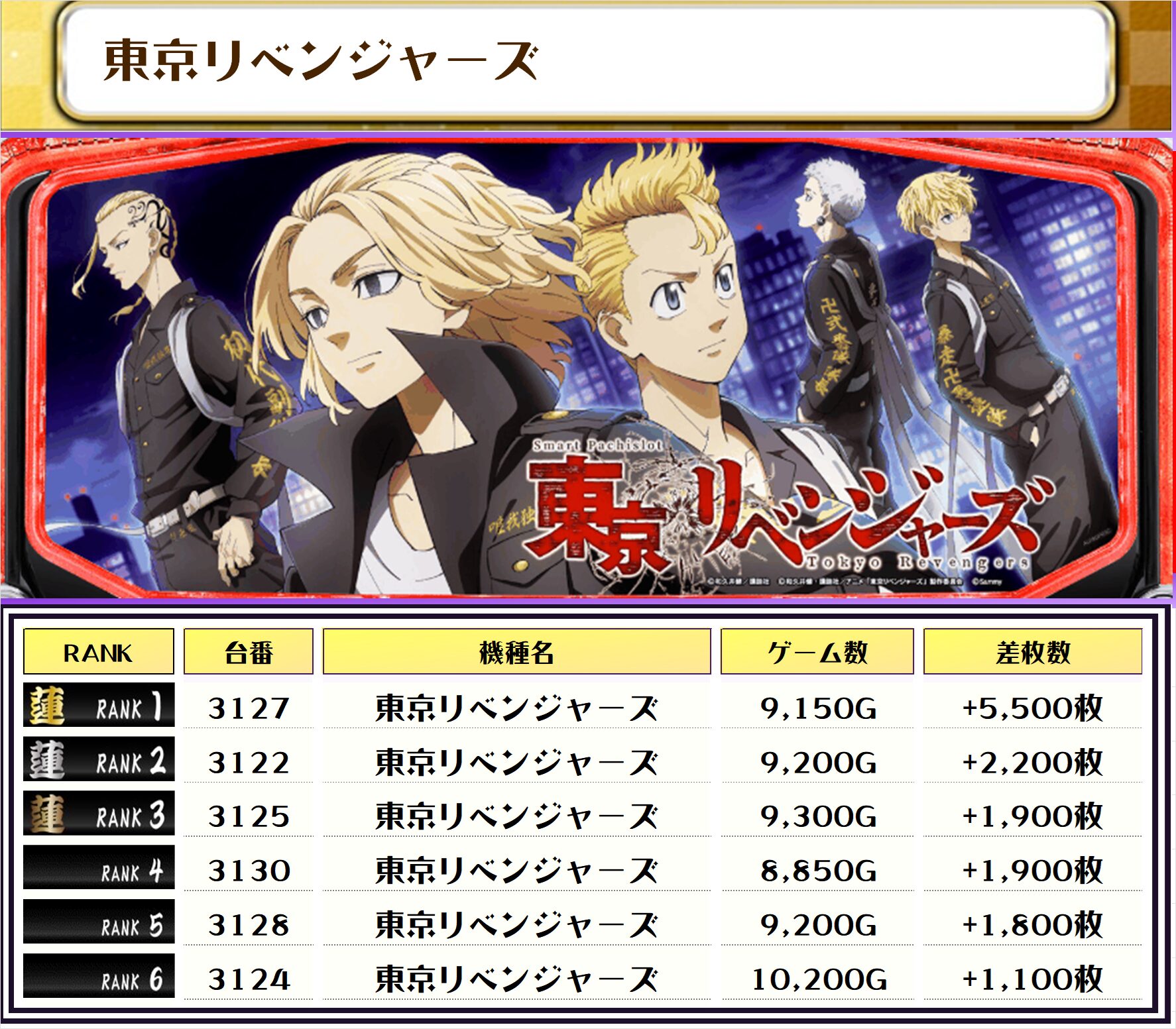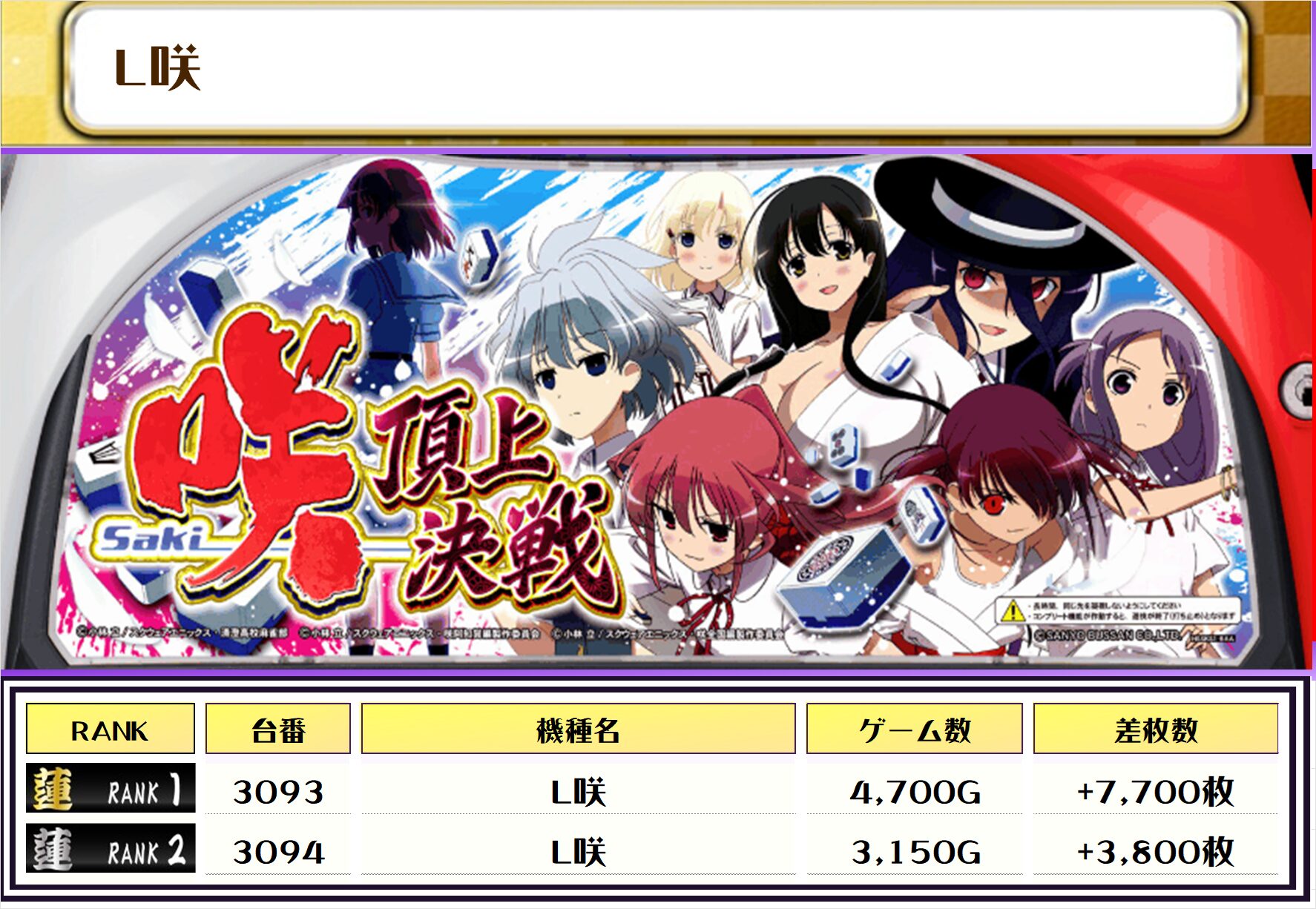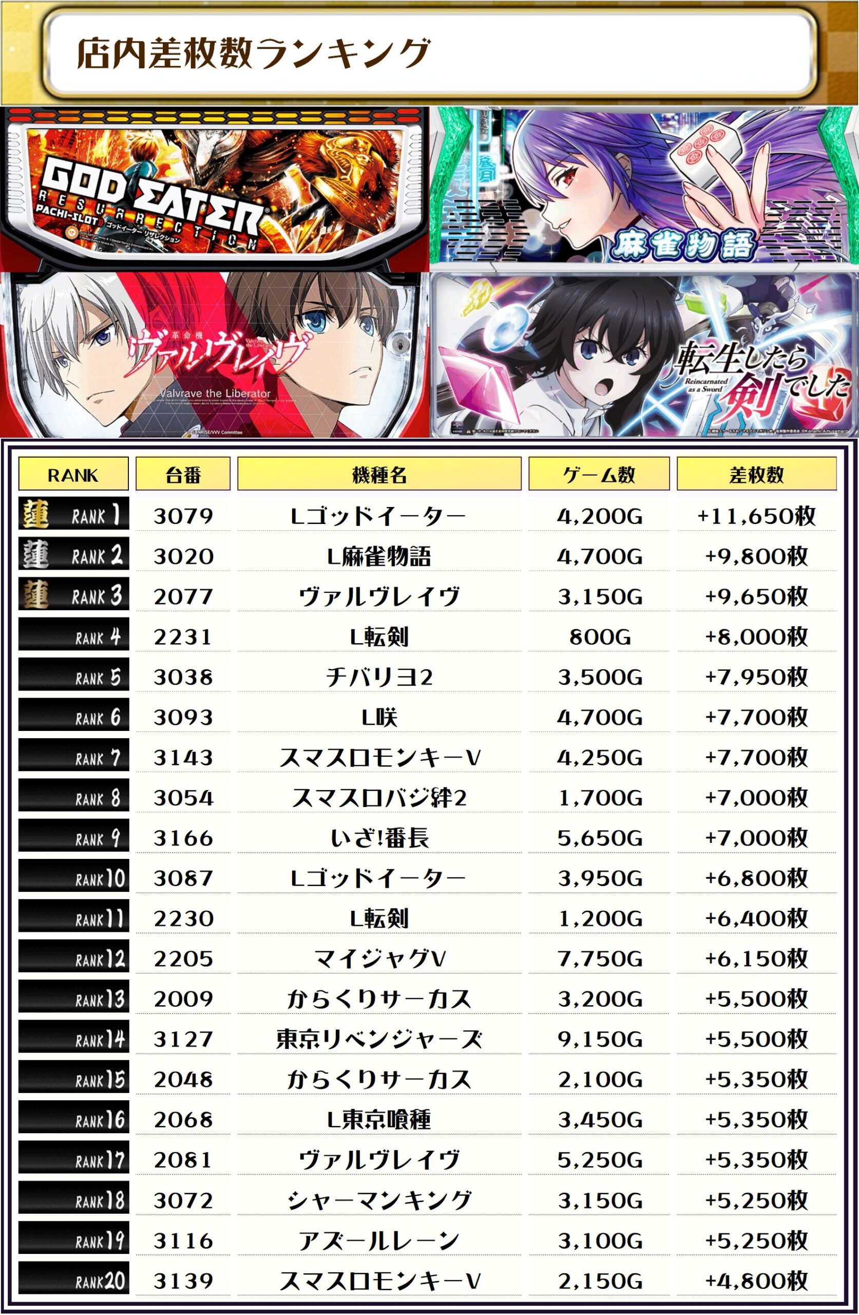 2位には【L麻雀物語・3020番台】の+9,800枚、3位は【ヴァルヴレイヴ・2077番台】の+9,650枚がランクインっ🏆🏆🏆🏆
