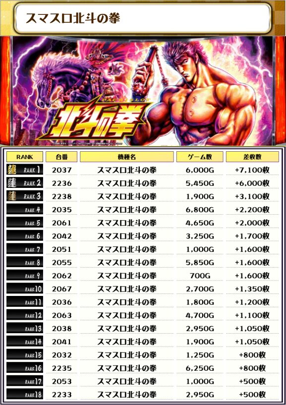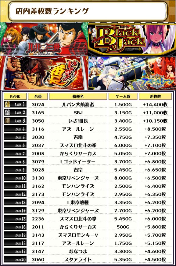 2位には【SBJ・3165番台】の+11,000枚、【いざ!番長・3050番台】の+10,150枚がランクインっ🏆🏆🏆🏆