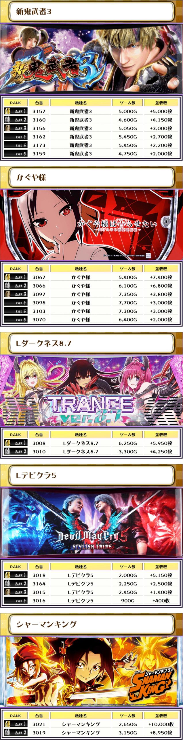 新鬼武者3・Lダークネス8.7・かぐや様・Lデビクラ5・シャーマンキング・ジャグラーガールズは稼働が非常に高く、見ていた感じは半分以上が優秀台だったように思う💪💪💪