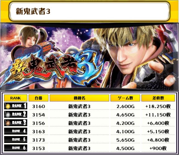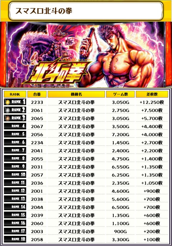 2位には【スマスロ北斗の拳・2233番台】の+12,250枚、そして3位には【新鬼武者3・3154番台】の+11,150枚がランクインっ🏆🏆🏆🏆