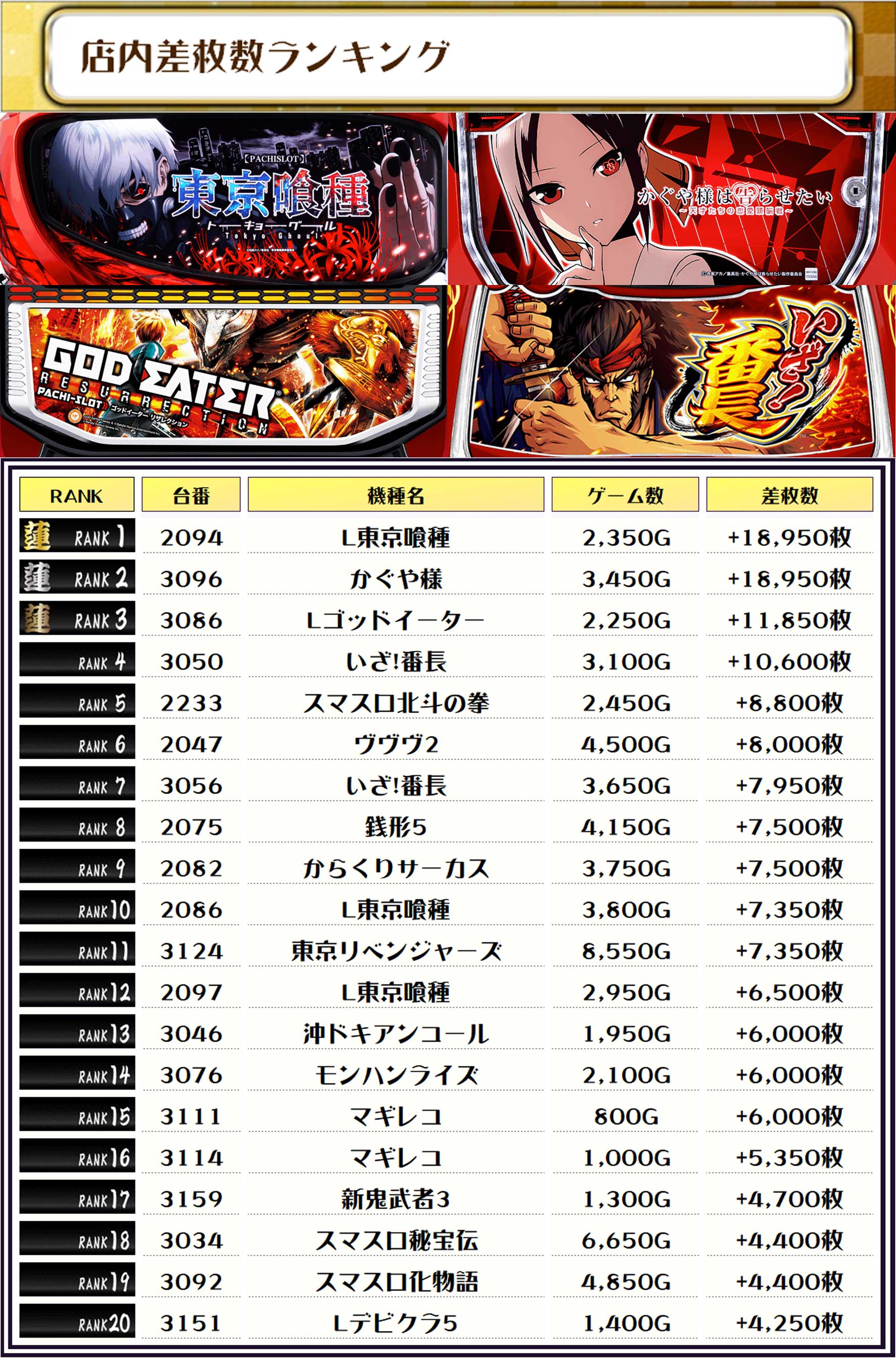 この日、全体の差枚トップに輝いたのは【L東京喰種・2094番台】で+18,950枚‼️