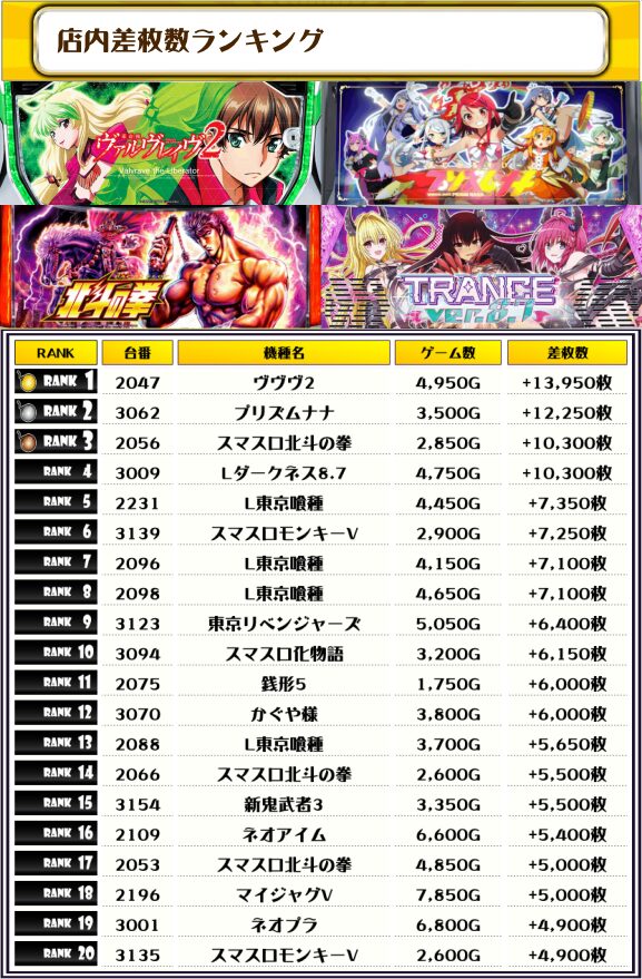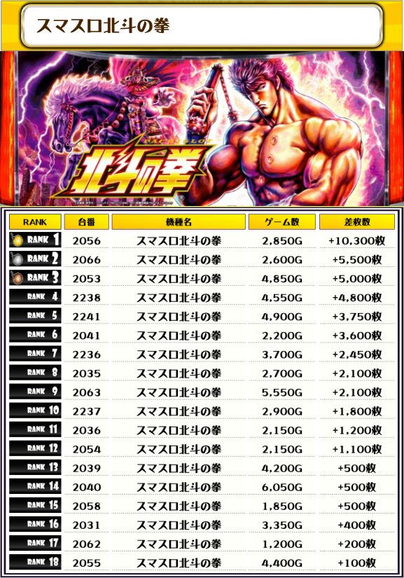 続く2位には【プリズムナナ・3062番台】の+12,250枚、そして3位には【スマスロ北斗の拳・2056番台】の+10,300枚がランクインっ‼️