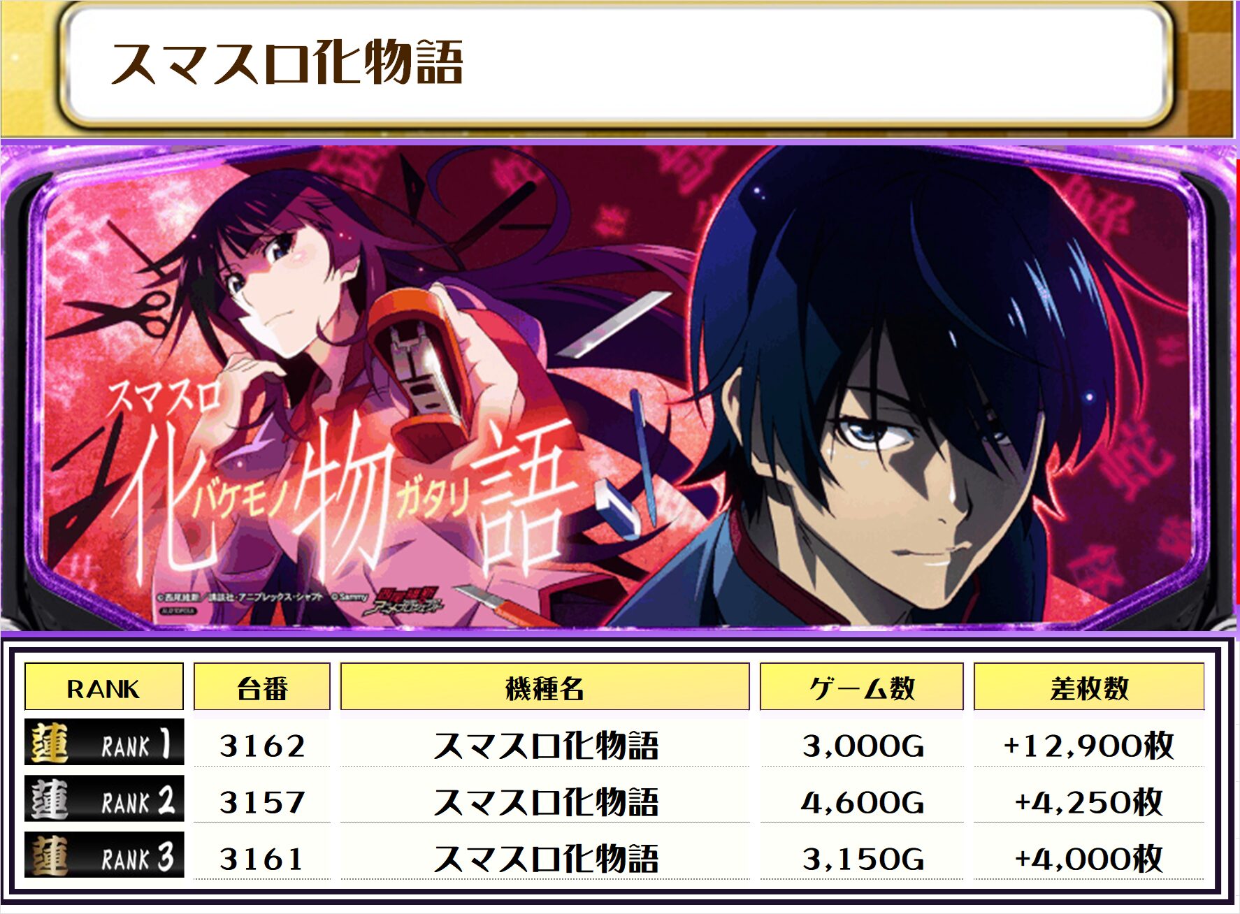 この日、全体の差枚トップに輝いたのは【スマスロ化物語・3162番台】で+12,900枚‼️