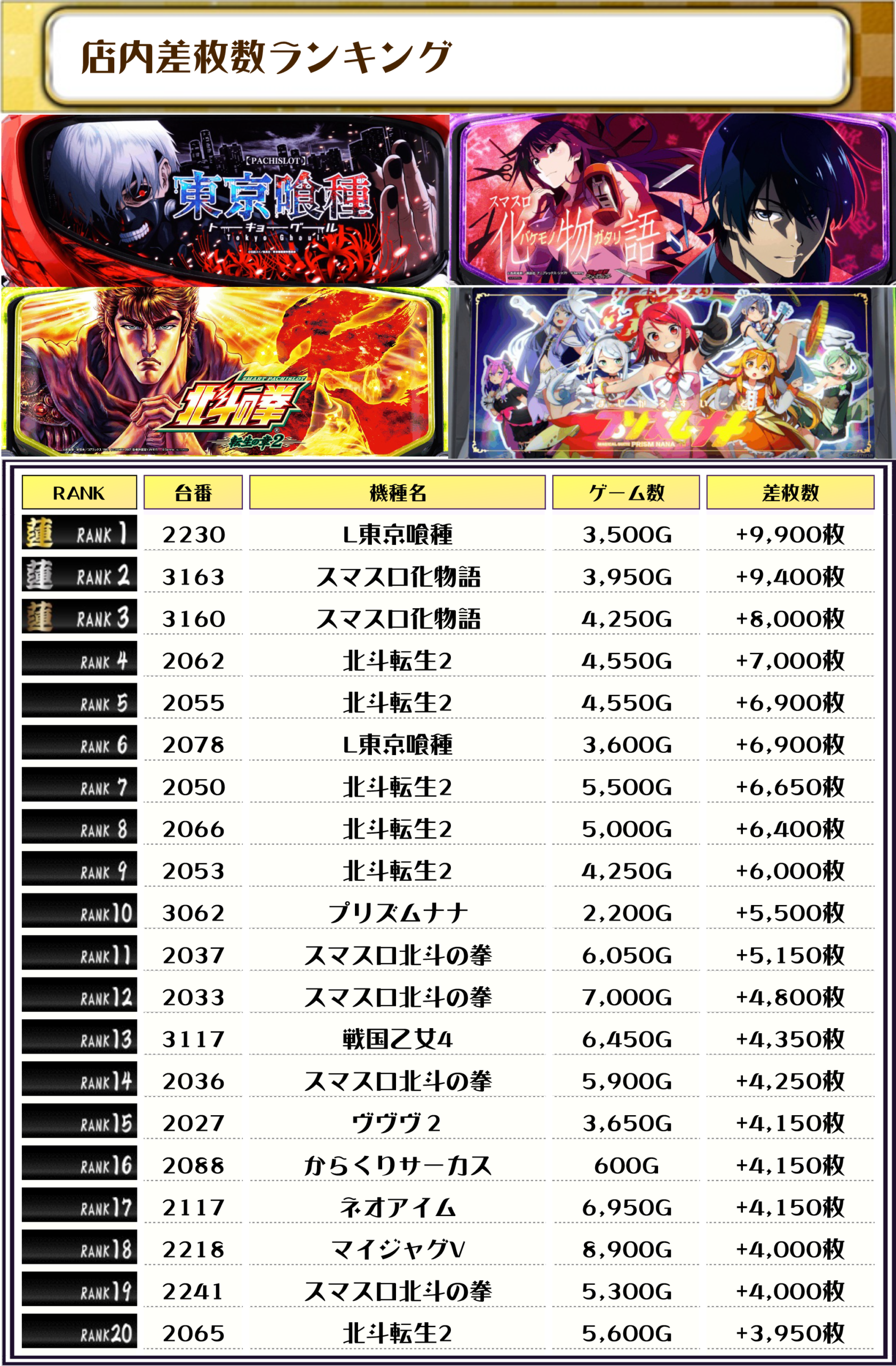 続く2位には【スマスロ化物語・3163番台】の+9,400枚、そして3位にも【スマスロ化物語・3160番台】の+8,000枚がランクインっ🏆🏆🏆🏆