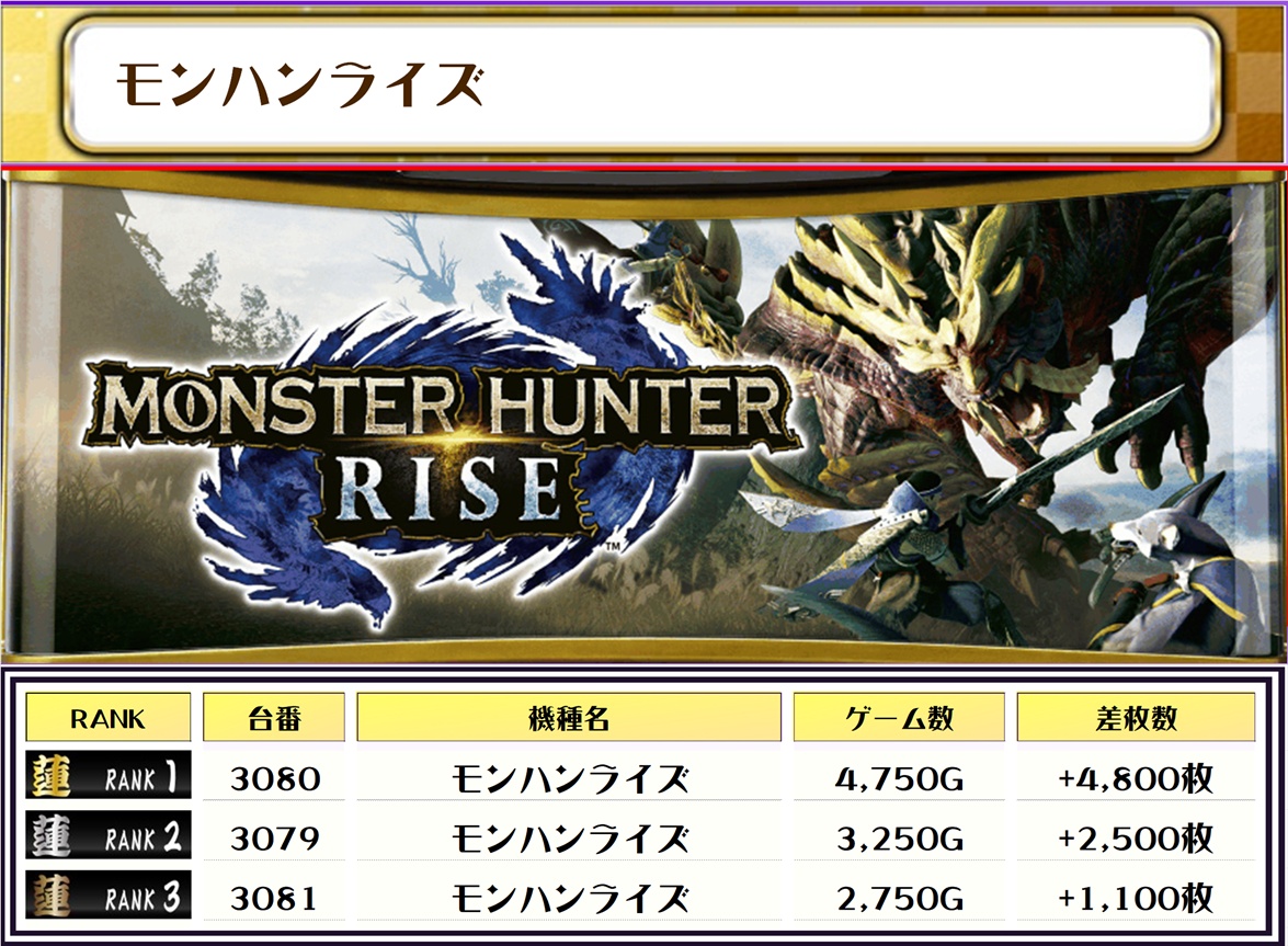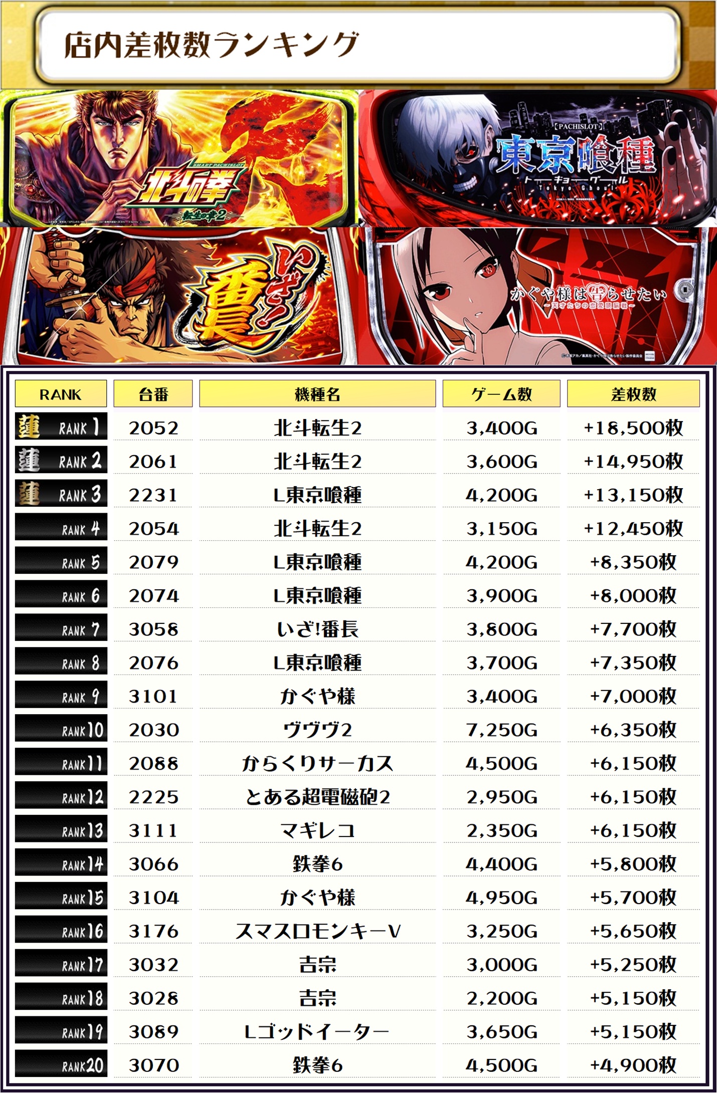 2位は【北斗転生2・2061番台】の+14,950枚、3位には【L東京喰種・2231番台】の+13,150枚がランクインっ🏆🏆🏆🏆