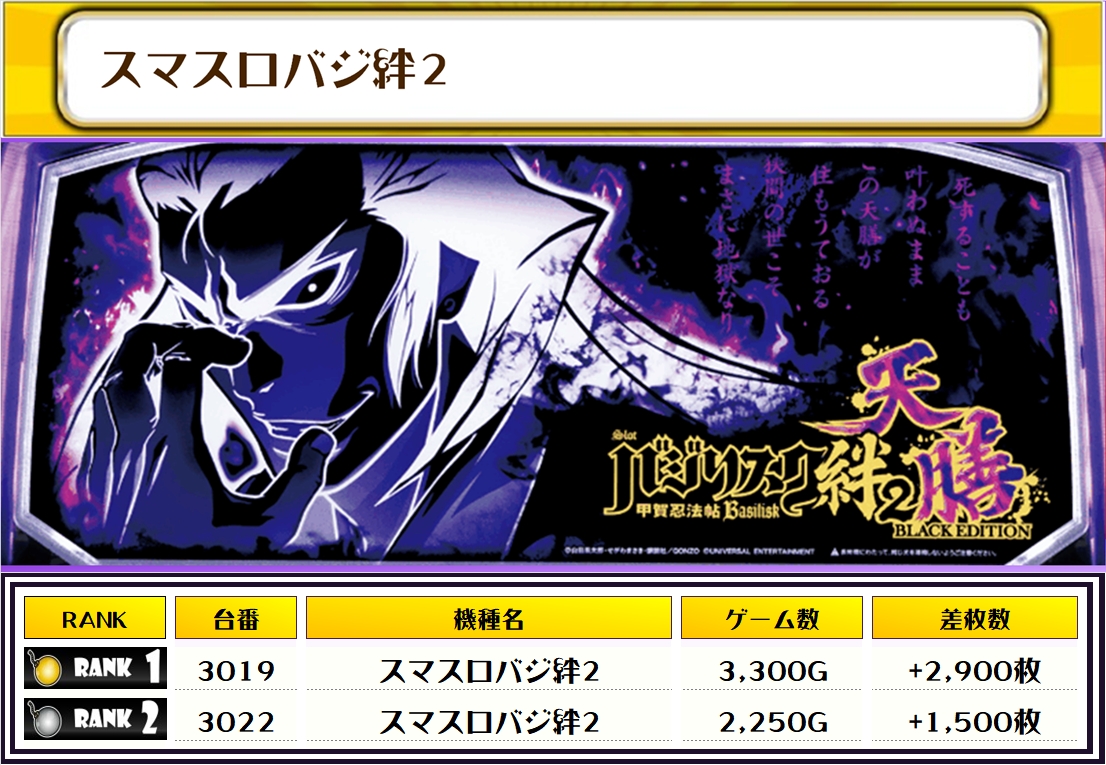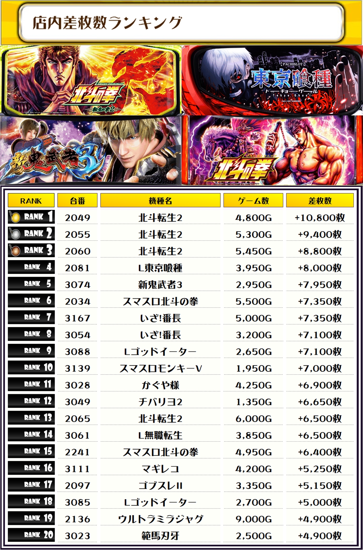 続く2位にも同じく【北斗転生2・2055番台】の+9,400枚、そして3位にもまたまた同じく【北斗転生2・2060番台】の+8,800枚がランクインっ‼️