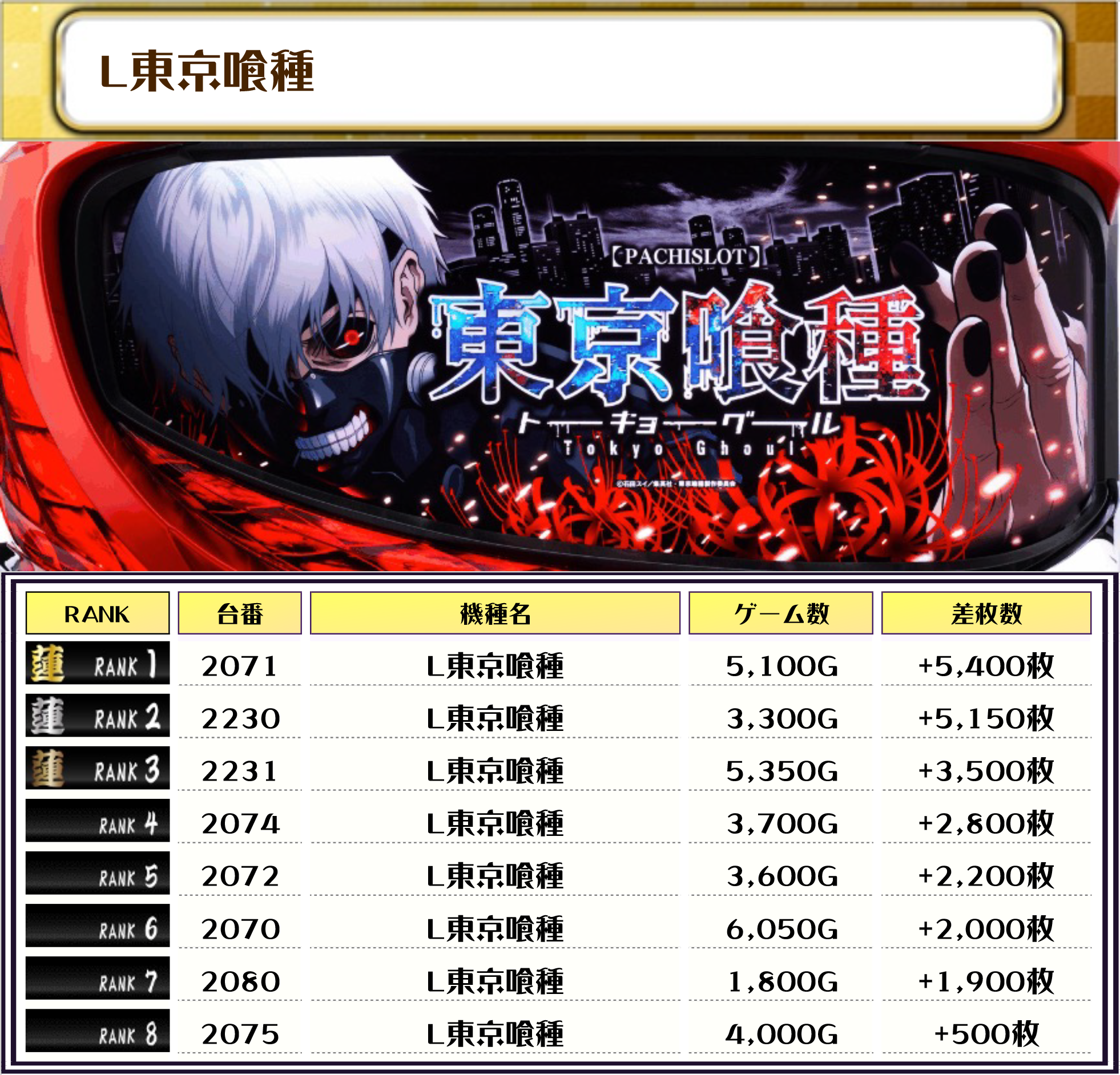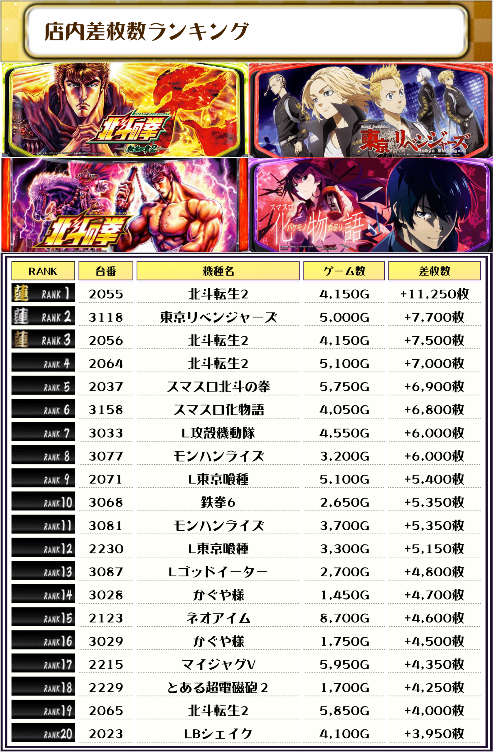 続く2位には【東京リベンジャーズ・3118番台】の+7,700枚、そして3位には【北斗転生2・2056番台】の+7,500枚がランクインっ🏆🏆🏆🏆