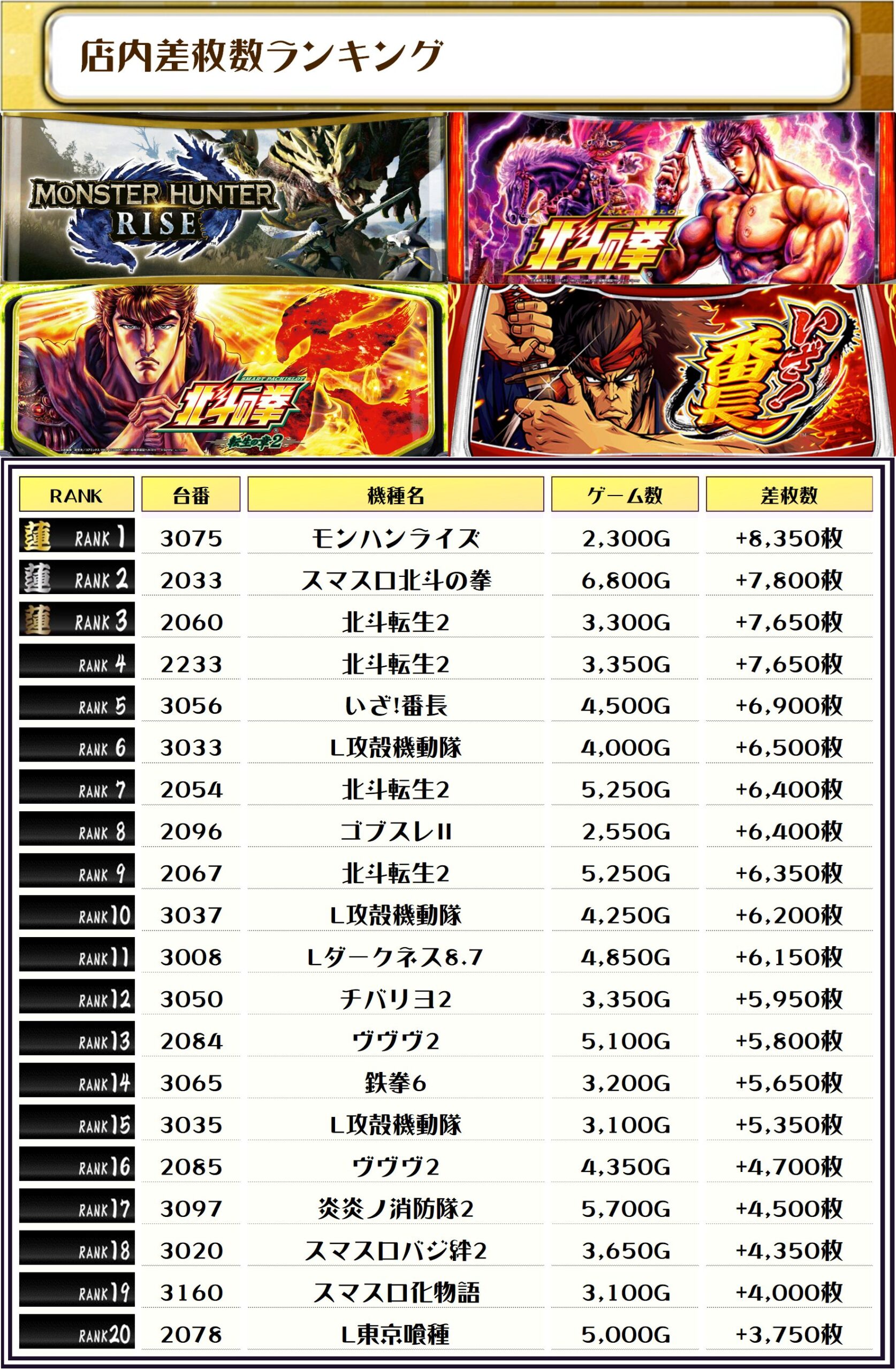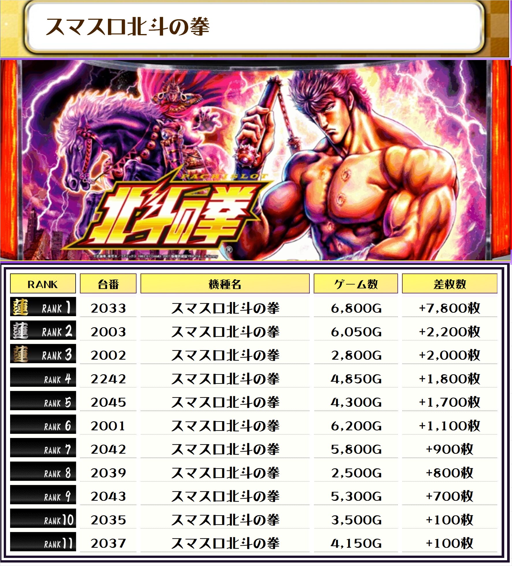 続く2位には同率で【スマスロ北斗の拳・2033番台】の+7,800枚、そして3位には【北斗転生2・2060番台】の+7,650枚がランクインっ🏆🏆🏆🏆