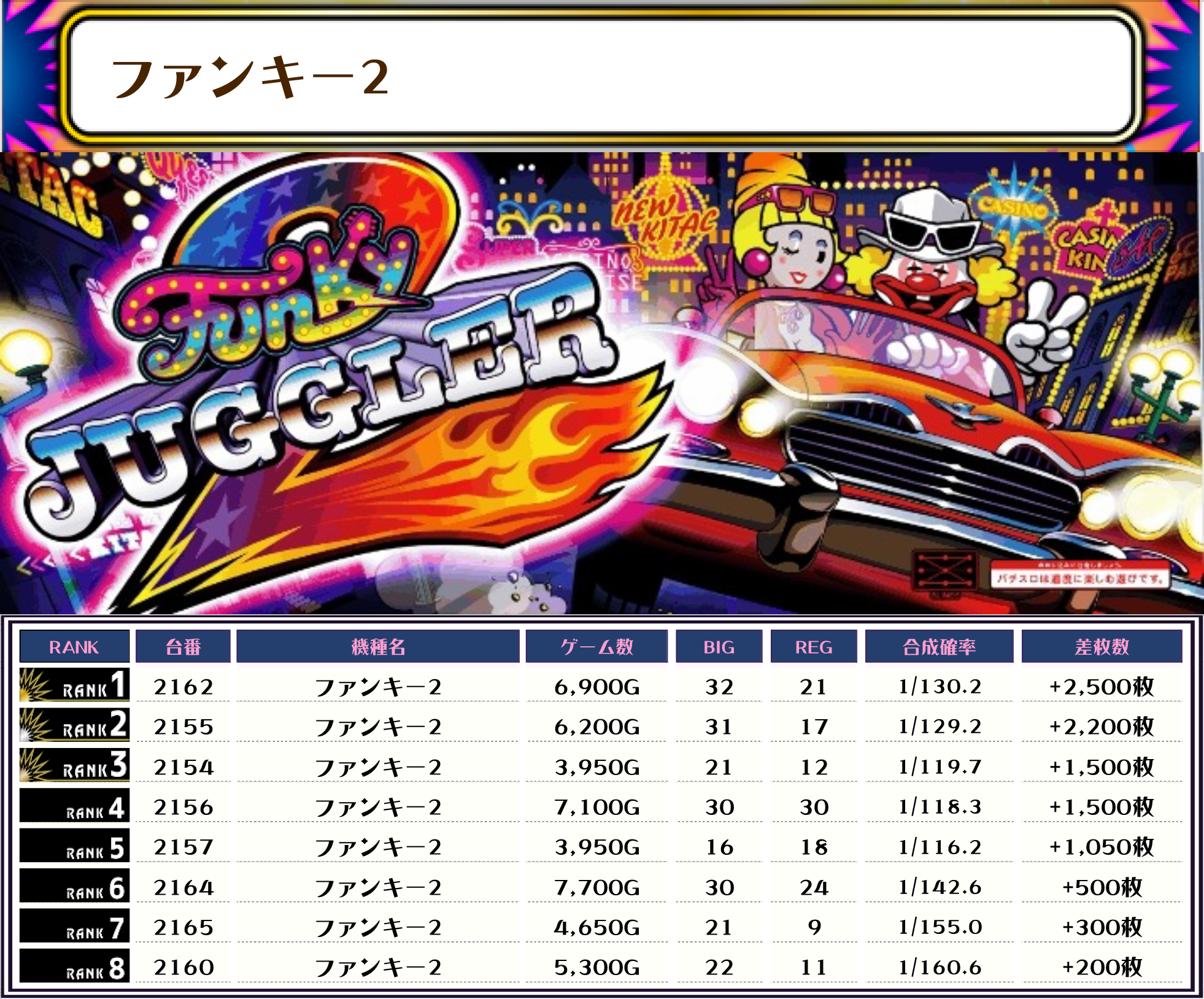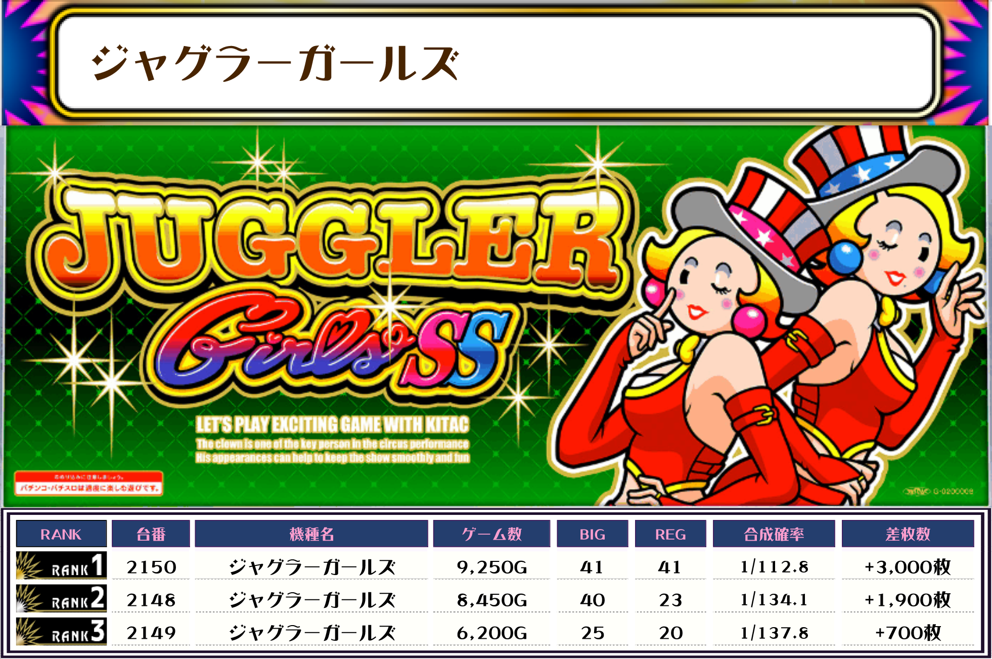 ジャグ系は全体的に人気でしたが特にピックアップしたジャグラーガールズ・ウルトラミラジャグ・ファンキー2は優秀台が多かったです✨