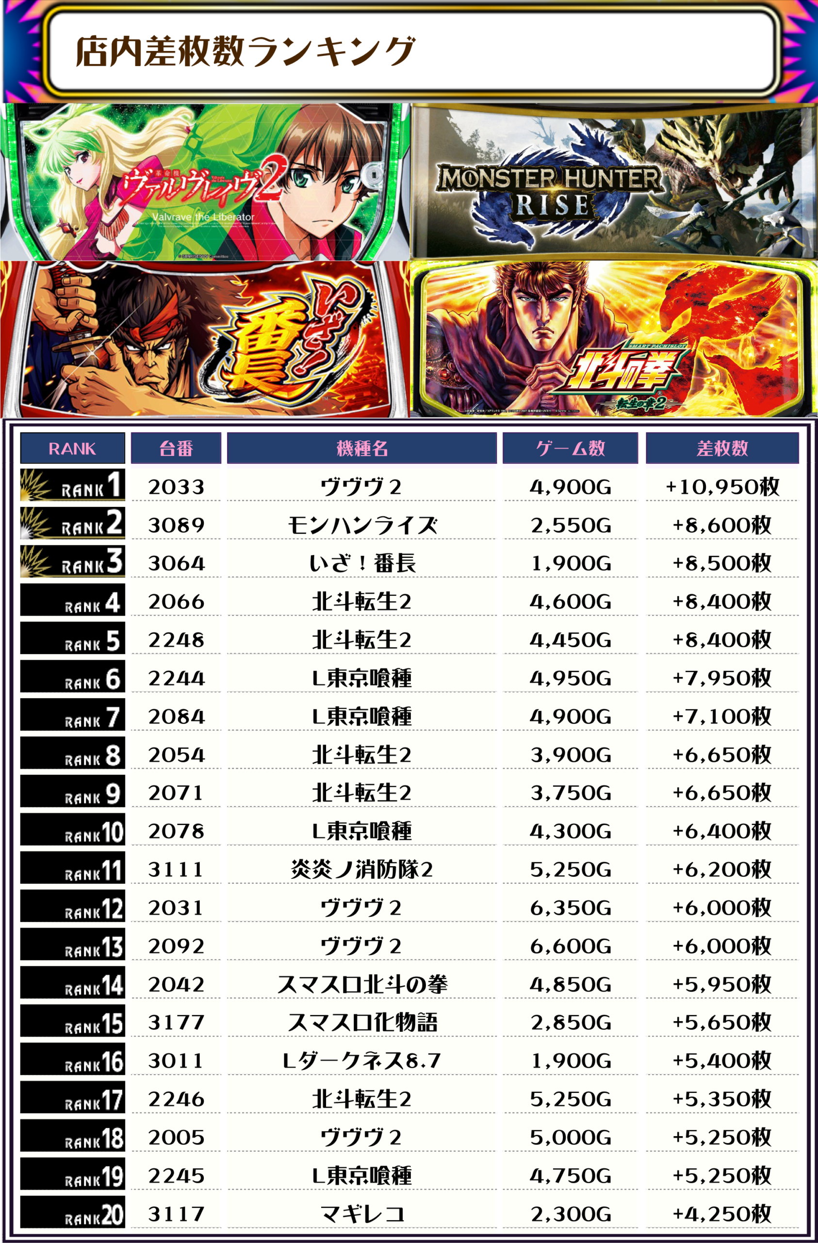 続く2位には【モンハンライズ・3089番台】の+8,600枚、そして3位には【いざ!番長・3064番台】の+8,500枚がランクインっ‼️