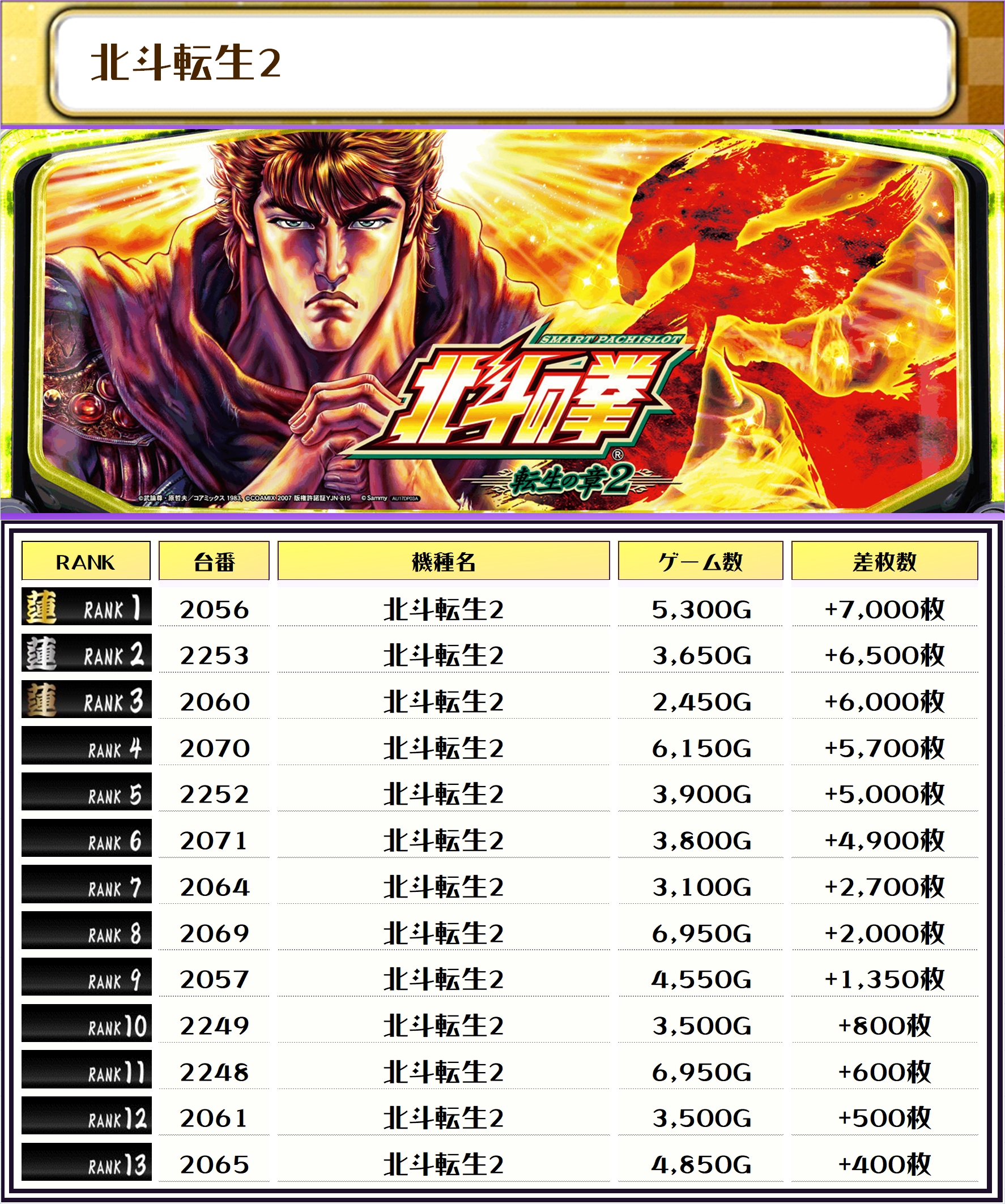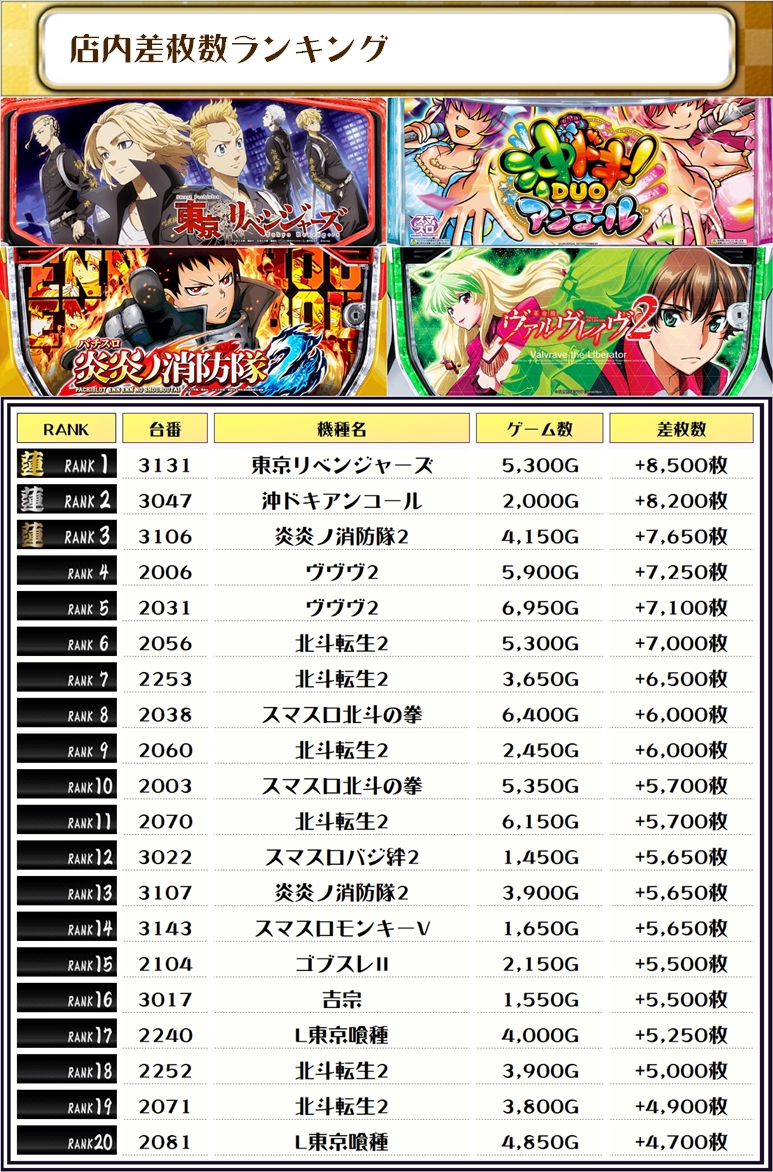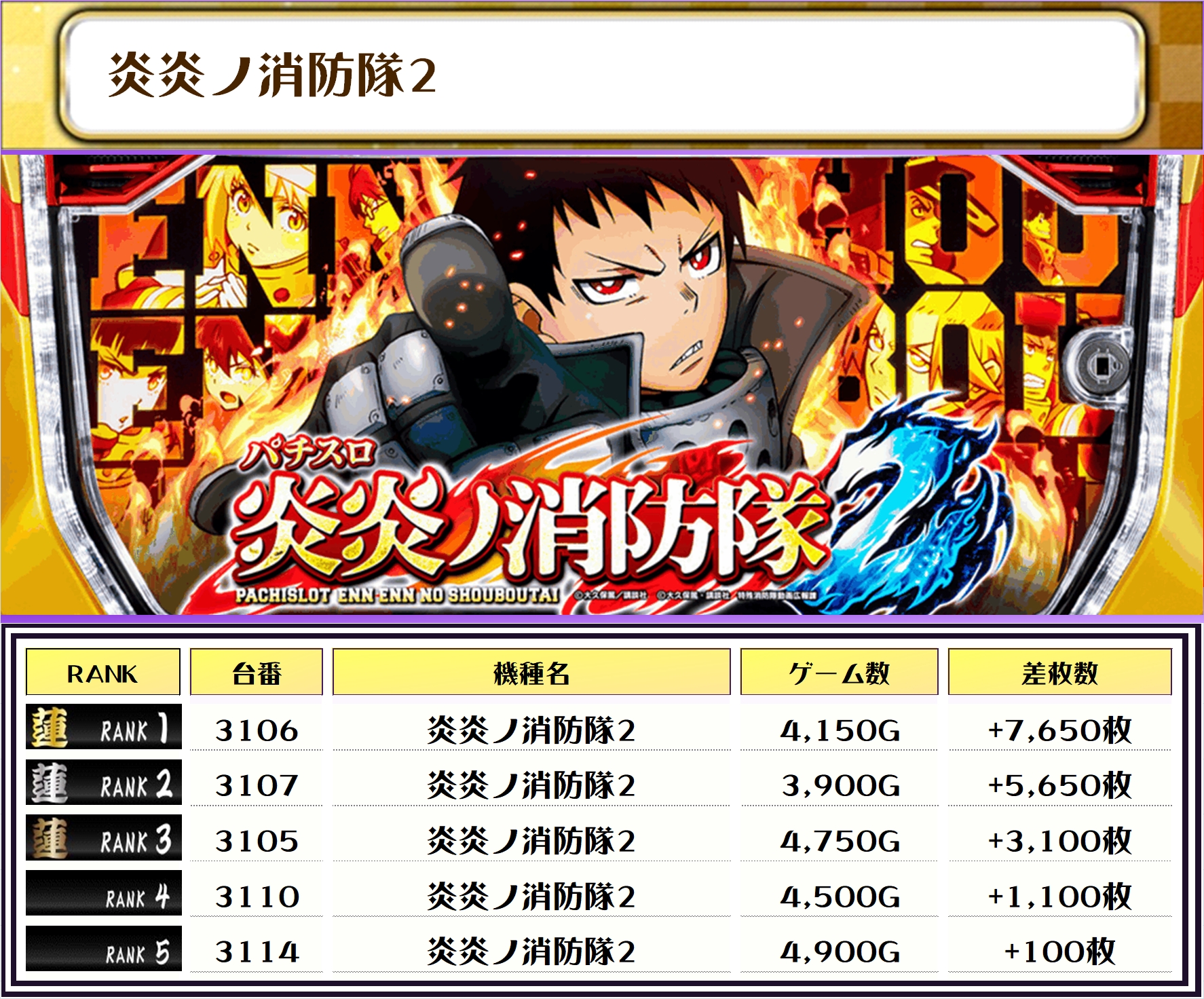 2位は【沖ドキアンコール・3047番台】の+8,200枚、3位は【炎炎ノ消防隊2・3106番台】の+7,650枚がランクインっ🏆🏆🏆