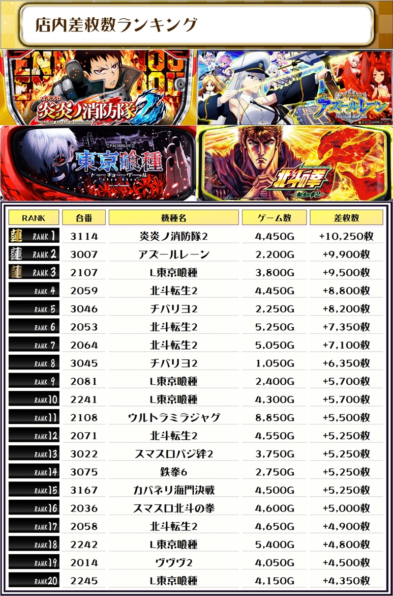 2位は【アズールレーン・3007番台】の+9,900枚、3位は【L東京喰種・2107番台】の+9,500枚がランクインっ🏆🏆🏆